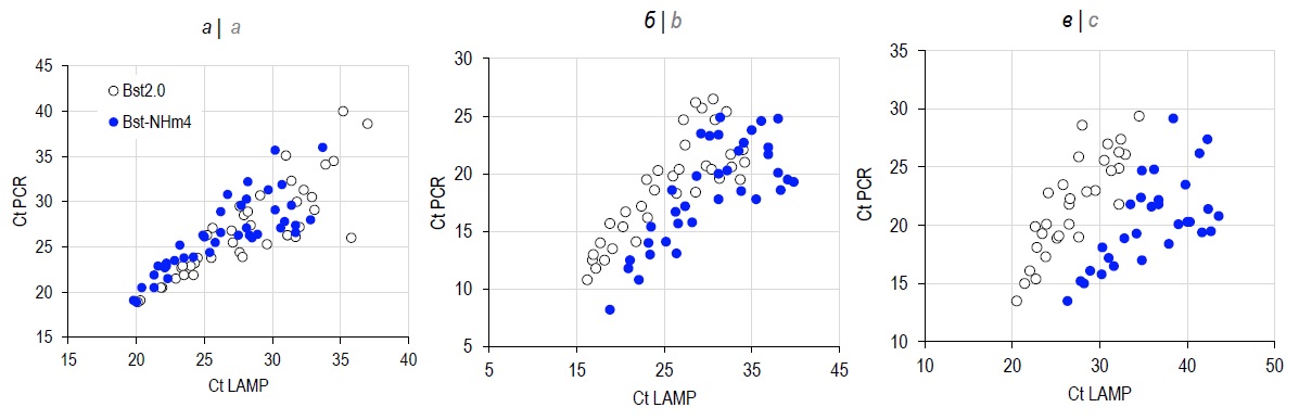 The obtained results confirm that LAMP-based reagent kits have high diagnostic specificity (100%) compared to PCR test systems when used for analysis of RNA samples at a concentration of minimum 104 copies/ml. A major advantage of LAMP-based reagent kits is a significant reduction in the testing time (31 min) compared to PCR using AmpliSens® COVID-19-FL (103 min) and AmpliSens® Influenza virus A/B-FL (150 min) reagent kits due to the shorter time required for the amplification program.