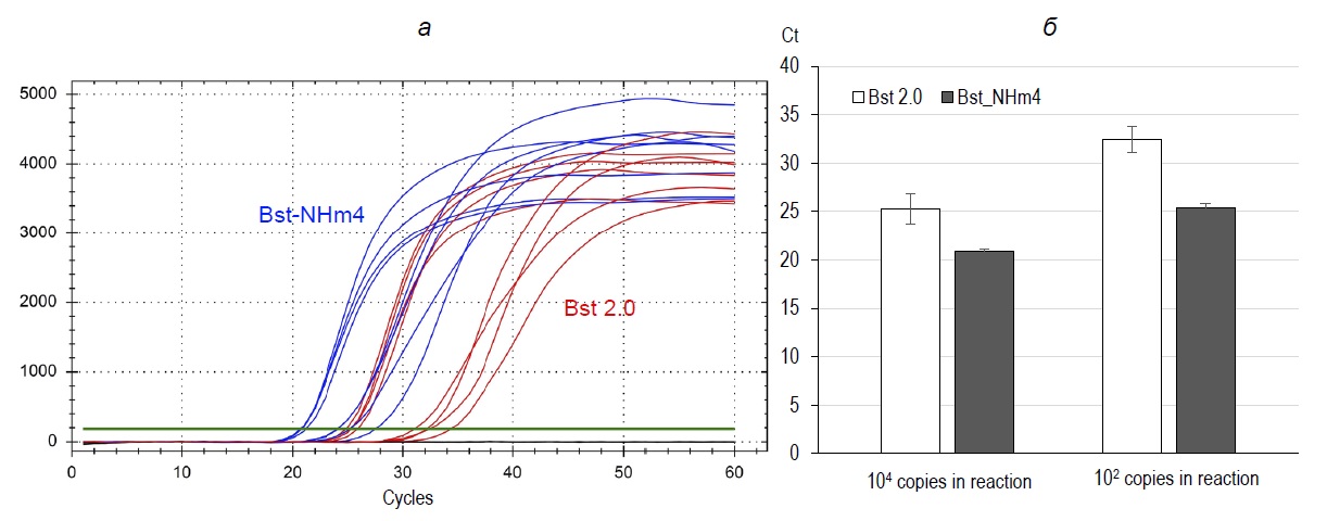 Fig. 4. Assessment of Bst-NHm4 polymerase activity in the model system. a — product accumulation curves; b — mean cycle threshold value.