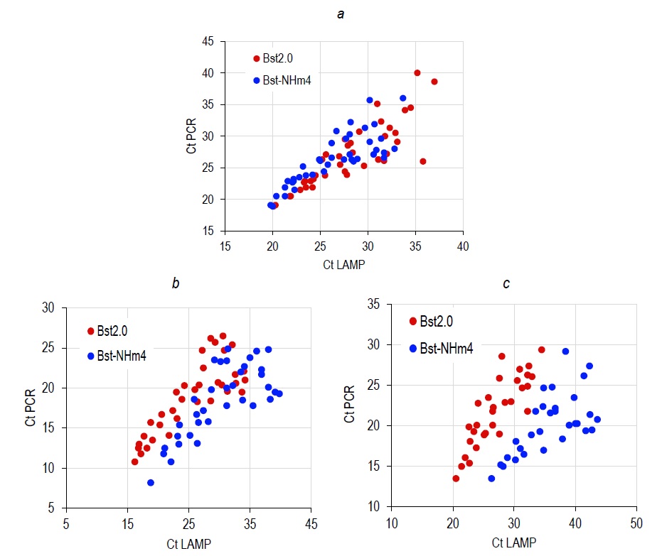 Nucleic acid amplification methods are widely used for diagnostics of infectious diseases, for detection of single nucleotide substitutions in genotyping and for other clinical purposes. However, the conventional polymerase chain reaction (PCR) is a time-consuming process and requires expensive specialized equipment. The comparatively recent technique developed by Notomi et al. for rapid detection of nucleic acid bases is loop-mediated isothermal amplification (LAMP) demonstrating high sensitivity and specificity in amplification of the target DNA sequence at constant temperatures in any temperature-controlled equipment, requiring no thermal cycles and speeding up the process [1–4]. The LAMP technique is widely used for detection of agents of infectious diseases of viral etiology such as SARS-CoV-2 [5], influenza viruses and respiratory syncytial virus [6], hepatitis C virus [7], dengue virus DENV [8], human immunodeficiency virus HIV [9], and Ebola virus EVD [10].
