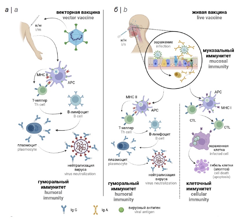 The protective activity of live-attenuated vaccines for intranasal application (mucosal vaccines) employs the same mechanisms that participate in the development of acquired immunity during natural infection (Fig. 2, b). When the respiratory virus enters nasal and/or oral cavities, the lymphoid tissues associated with the mucosa of the respiratory and digestive tract turn into the first line of defense against viral infection. This process involves all components of innate upper respiratory immunity - cellular (neutrophils, macrophages, dendritic cells, resident microfold M cells, innate lymphoid cells, natural killer cells and mast cells) as well as soluble molecules (galectins, collectins, cytokines, etc.). The activation of the first line of defense is followed by activation of dendritic cells in the focus of infection; they take up, process and present viral antigens. Such activated dendritic cells "loaded" with viral antigens migrate to regional lymph nodes; antigens are presented to naïve T cells, thus triggering their further differentiation and activation of adaptive immunity, which is accompanied by production of cytotoxic T cells and helper T cells. Specific naïve B cells recognize viral antigens either without any assistance or when they are presented by follicular dendritic cells as an antigen-antibody complex in a Fc-receptor-connected manner. The interaction of activated helper T cells and B cells triggers the humoral immune response. The simultaneous expansion of CD4+ helper T cells, CD8+ cytotoxic T cells in the focus of infection and production of antibodies by plasma cells is of critical importance for elimination of the virus [41, 47, 48]. The combined activation of humoral and cellular components of the systemic and mucosal immune protection can provide effective protection against infection with SARS-CoV-2 [47].