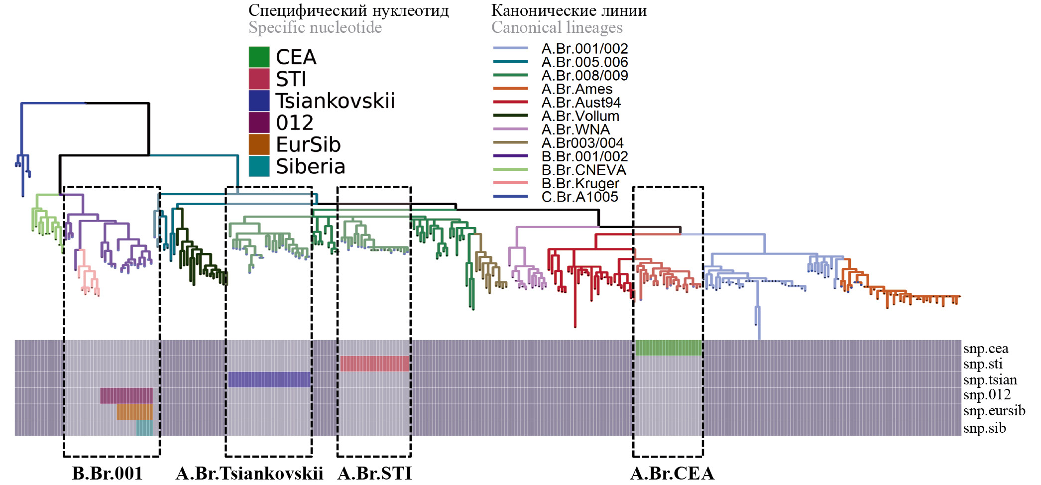 Данное исследование является логическим продолжением работы [25]. В ней на основе WGS-SNP-анализа корового генома набора штаммов были подробно описаны генетические сублинии, распространённые на территории России и приграничных стран. В ходе исследования было выяснено, что из 66 исследованных штаммов в коллекции патогенных микроорганизмов Ставропольского противочумного института Роспотребнадзора 49 относились к линии A, остальные 17 штаммов — к линии B. Штаммы линии A неравномерно распределялись между 5 каноническими группам. Больше всего, 35 штаммов, относилось к группе A.Br.008/011, 6 штаммов — к A.Br.Ames, 5 штаммов — к A.Br.Aust94, 2 штамма — к A.Br.001/002, 1 штамм — к A.Br.005/006. Все штаммы основной линии B принадлежали к канонической группе B.Br.001/002. Наиболее типичными для территории России и ближайших стран, имеющими наибольшую эпидемиологическую значимость, являются генетические субкластеры A.Br.STI, A.Br.Tsiankovskii в группе A.Br.008/011, а также новые — A.Br.CEA в группе A.Br.Aust94 и B.Br.Europe, B.Br.Sibеria, B.Br.Asia, B.Br.018 в группе B.Br.001/002. Однако метод молекулярного субтипирования для дифференциации этих субкластеров без использования WGS-SNP не разработан.