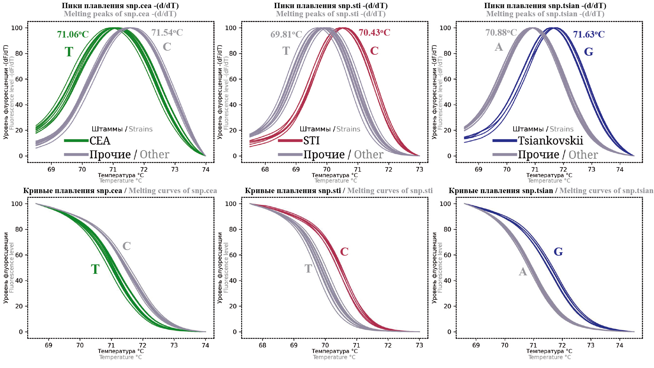Для snp.cea температура пика плавления ДНК штаммов специфической группы составила 71,06 ± 0,08oC, а для неспецифической — 71,54 ± 0,05oC. Температуры специфических групп для snp.sti и snp.tsian были равны 70,43 ± 0,07 и 71,63 ± 0,09oC, а неспецифических — 69,81 ± 0,08 и 70,88 ± 0,07oC соответственно (табл. 3, 6, рис. 2). Локусы snp.012, snp.eursib, snp.sib демонстрировали температуру плавления для специфических аллелей, равную 69,80 ± 0,13, 78,47 ± 0,07 и 73,81 ± 0,01oC соответственно; для неспецифических — 70,95 ± 0,12, 79,21 ± 0,08 и 74,59 ± 0,09oC соответственно (табл. 5, 6, рис. 3).