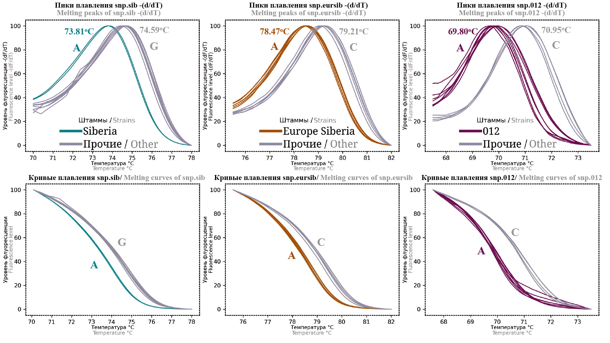 Рис. 3. Пики и кривые плавления при анализе штаммов кластеров B.Br.Siberia, B.Br.Europe и B.Br.Siberia, B.Br.012 по соответствующим локусам snp.sib, snp.eursib и snp.012.