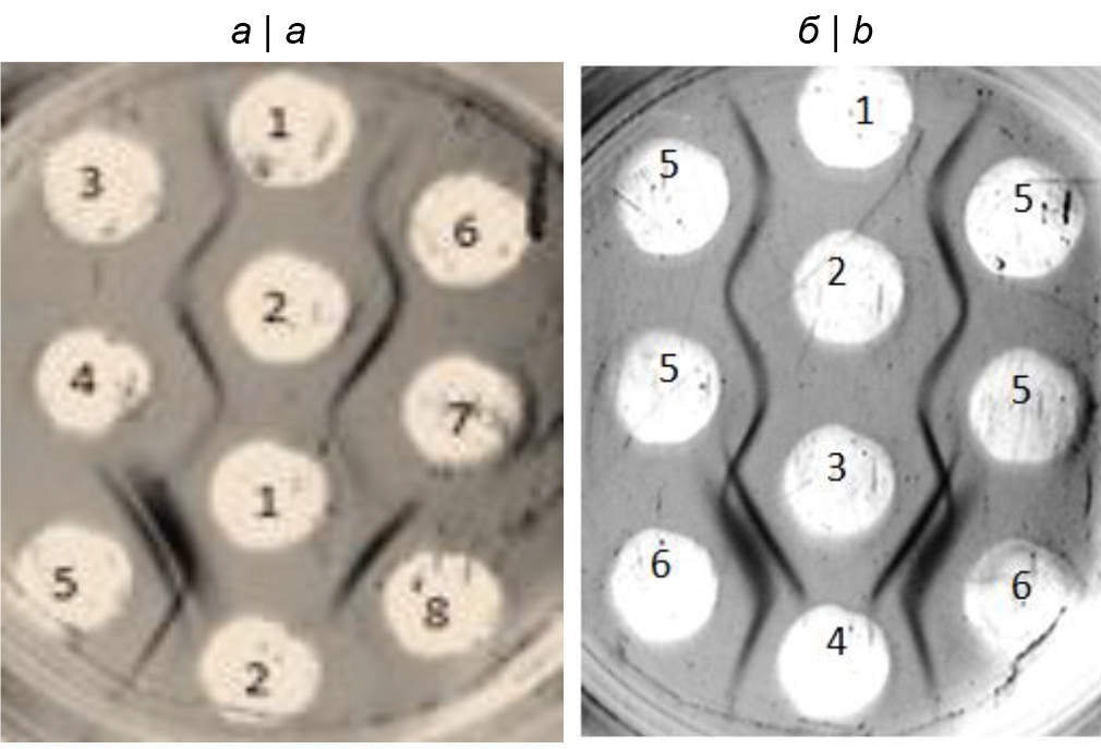 а: 1 — КФ B. anthracis 575/122 R01; 2 — КФ B. anthracis 575/122 R00; 3 — сыворотка к белку ЕА1 КФ B. anthracis 575/122 R00; 4 — сыворотка к фракции 1 КФ B. anthracis 575/122 R01; 5 — сыворотка к фракции 5 КФ B. anthracis 575/122 R01; 6 — сыворотка к фракции 1 КФ B. anthracis 575/122 R00; 7 — сыворотка к белку КФ B. anthracis 575/122 R00 ММ 87 кДа; 8 — сыворотка к ПА КФ B. anthracis 575/122 R01; б: 1 — сыворотка к фракции 1 КФ B. anthracis575/122 R01; 2 — сыворотка к белку ЕА1 КФ B. anthracis 575/122 R00; 3 — сыворотка к фракции 5 КФ B. anthracis 575/122 R01; 4 — сыворотка к ПА КФ B. anthracis 575/122 R01; 5 — КФ B. anthracis 575/122 R00; 6 — КФ B. anthracis 575/122 R01.