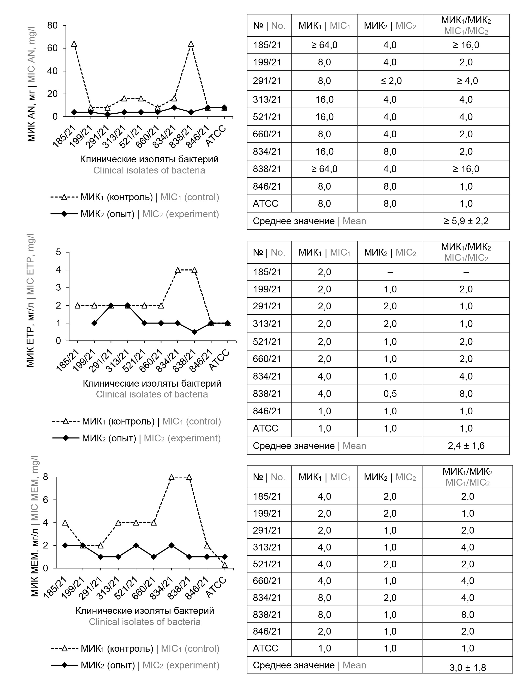 МИК антибиотиков в отношении изученных культур снизились в среднем в 2,35–23,2 раза по сравнению с контрольными значениями. В условиях опыта чувствительность изученных культур возросла к амоксициллин/клавулановой кислоте в ≥ 2 – ≥ 8 раз, пиперациллин/тазобактаму — в ≥ 2 – ≥ 32 раза, цефтазидиму — в 4 – ≥ 16 раз, амикацину — в 2 – ≥ 16 раз, эртапенему — в 2–8 раз, меропинему — в 2–8 раз, цефепиму — в ≥ 4 – ≥ 64 раз, ципрофлоксацину — в 4 – ≥ 16 раз, гентамицину — в 2 – ≥ 8 раз, норфлоксацину — в 2–8 раз, нитрофурантоину — в 2–4 раза.