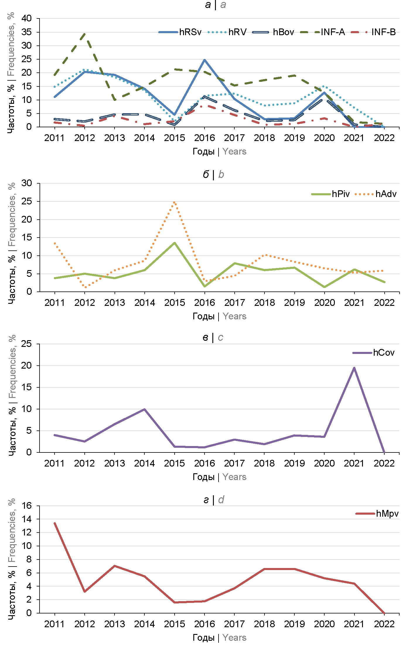 Table 1. Monitoring of ARVI pathogens in Moscow in 2011–2022 by RT2-PCR, frequency of occurrence, % of total number of samples