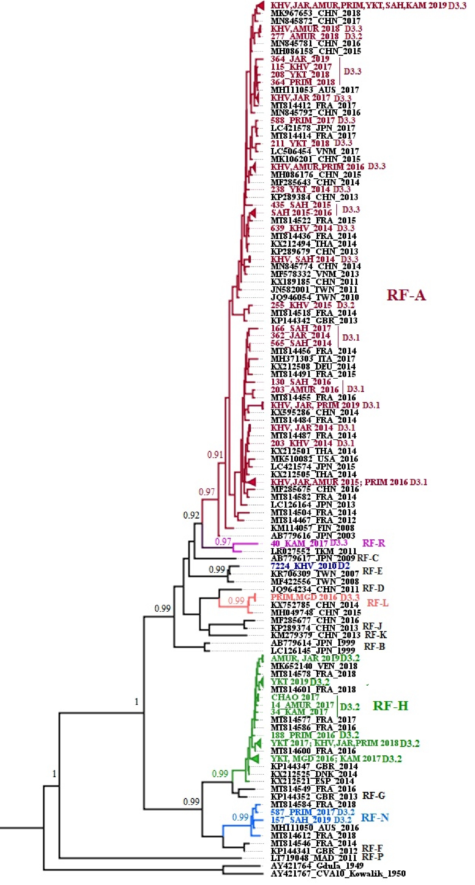 КВ-А6 подгруппы D3.1 (n = 18; 23,1%) достоверно кластеризовались с французскими и российскими штаммами и были идентифицированы в 5 субъектах (Хабаровский и Приморский края, ЕАО, Сахалинская и Амурская области) с 2014 по 2017 г. и в 2019 г. Общий предок для D3.1 циркулировал приблизительно в 2005 г. (95% ДИ 2005–2007).