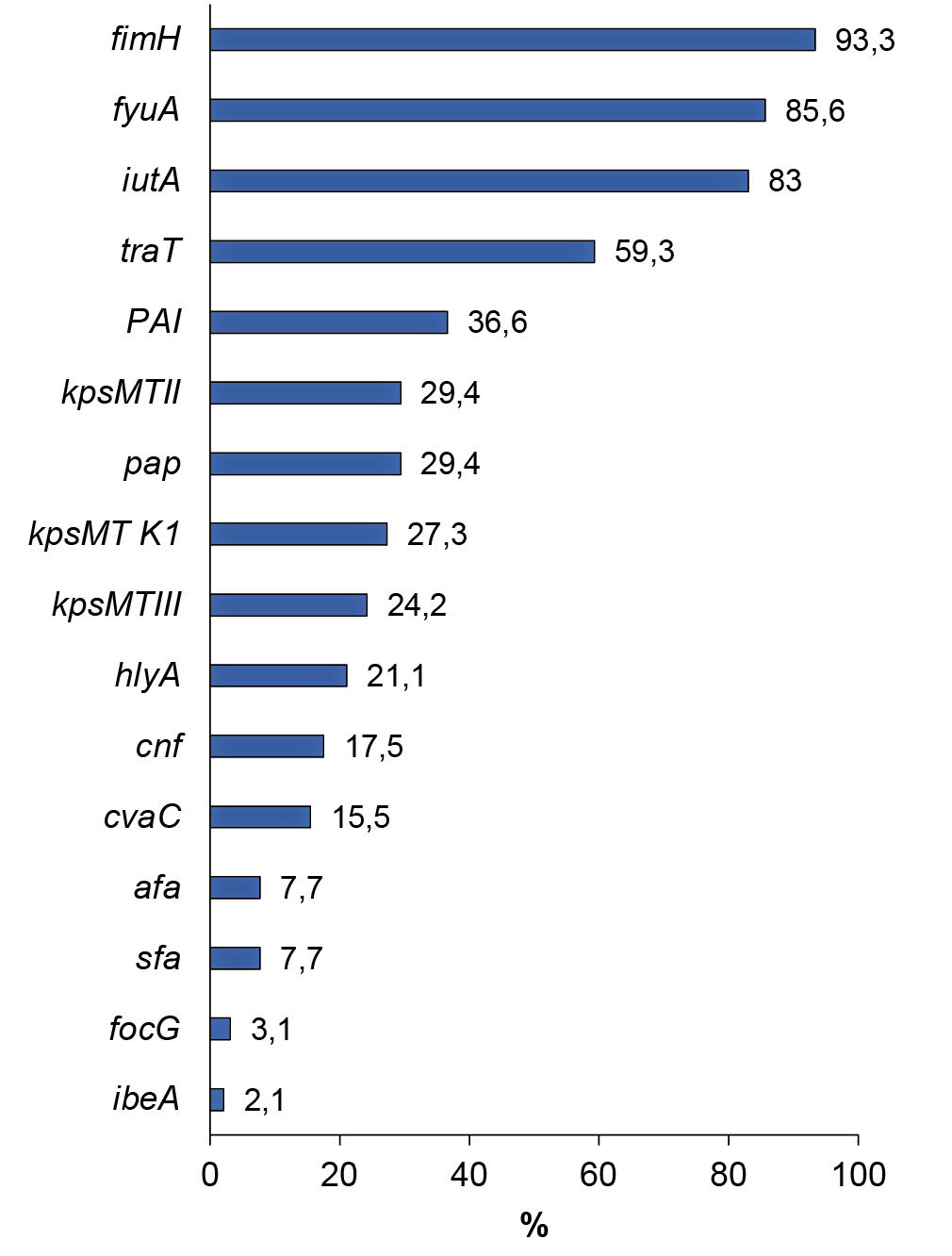 Strains were tested for the presence of 17 genes encoding the synthesis of virulence factors: Adhesins (pap, fimH, sfa, focG and afa), toxins (hlyA, cvaC, cnf and cdtB), capsule antigens (kpsMTII, kpsMTIII, kpsMT K1), siderophores (fyuA and iutA), invasins (ibeA), as well as for the presence of genetic markers of pathogenicity island (PAI) UPEC CFT073 and gene (traT) encoding a serum resistance.
