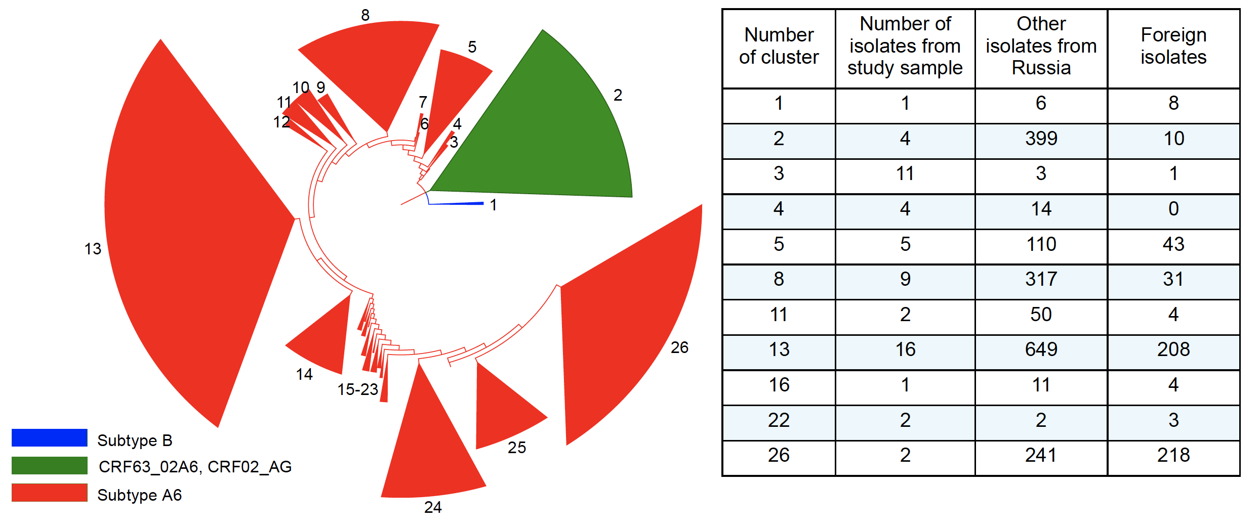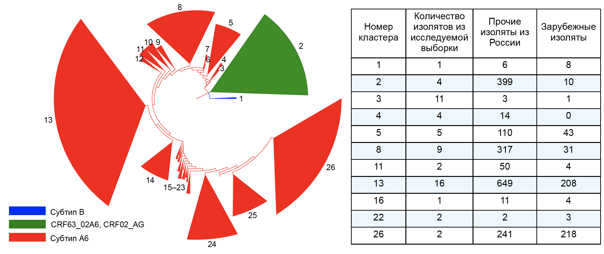 The largest cluster on the phylogenetic tree, cluster #13, containing 873 HIV genomes (29.8%; 95% CI 28.2–31.5), contained 16 strains from patients in the study group, as well as strains from patients of 19 foreign countries. The highest proportions of the 208 HIV strains from foreign countries in this cluster were strains circulating in Kyrgyzstan (29.3%), Belarus (23.6%), and Tajikistan (12.0%).