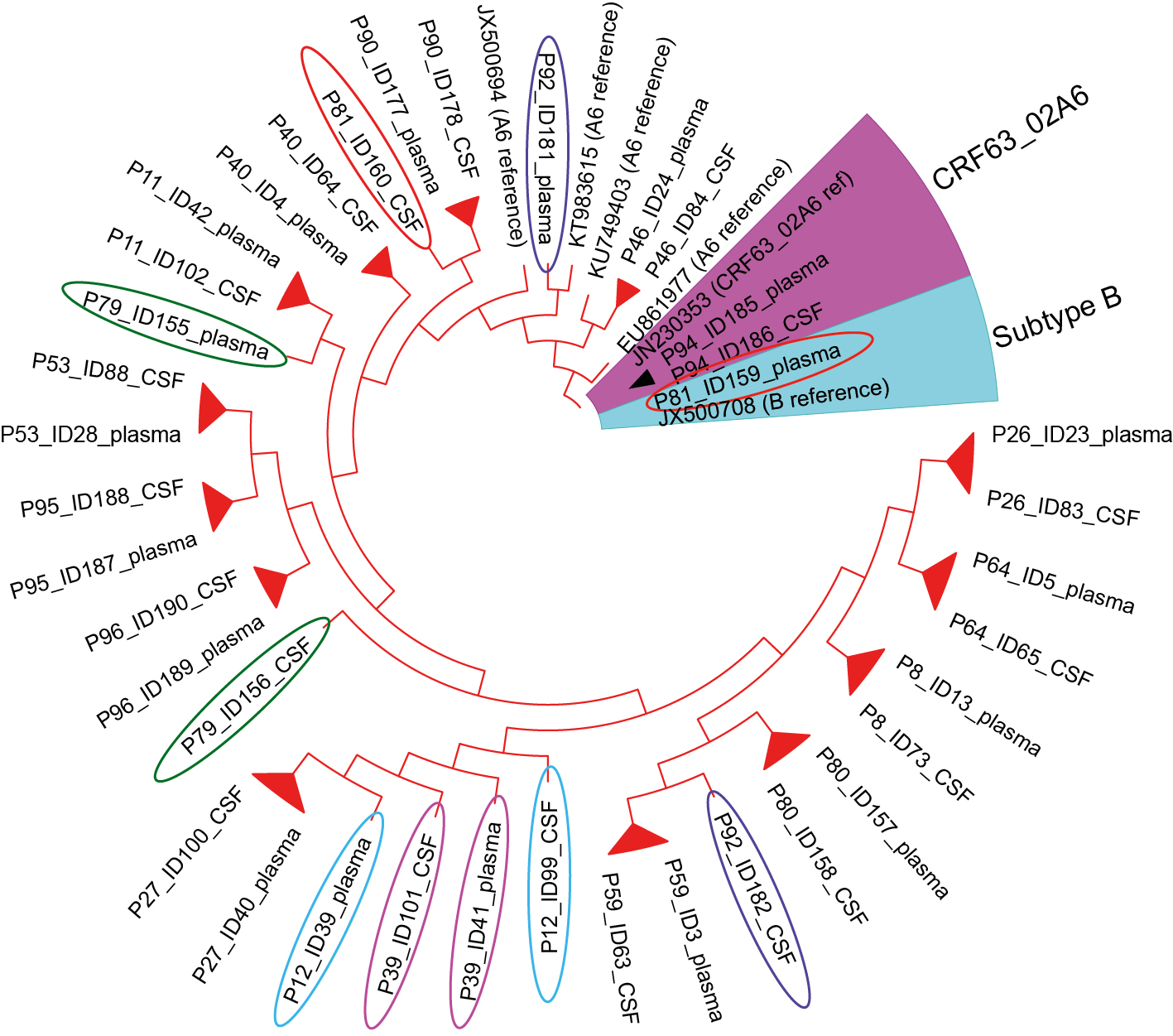 Fig. 4. Phylogenetic tree of 38 HIV-1 pol gene sequences from 19 patients obtained in pairs from blood plasma and CSF. Ovals of the same color indicate paired samples that have fallen into different clusters. Red branches and clusters contain HIV-1 subtype A6 sequences.