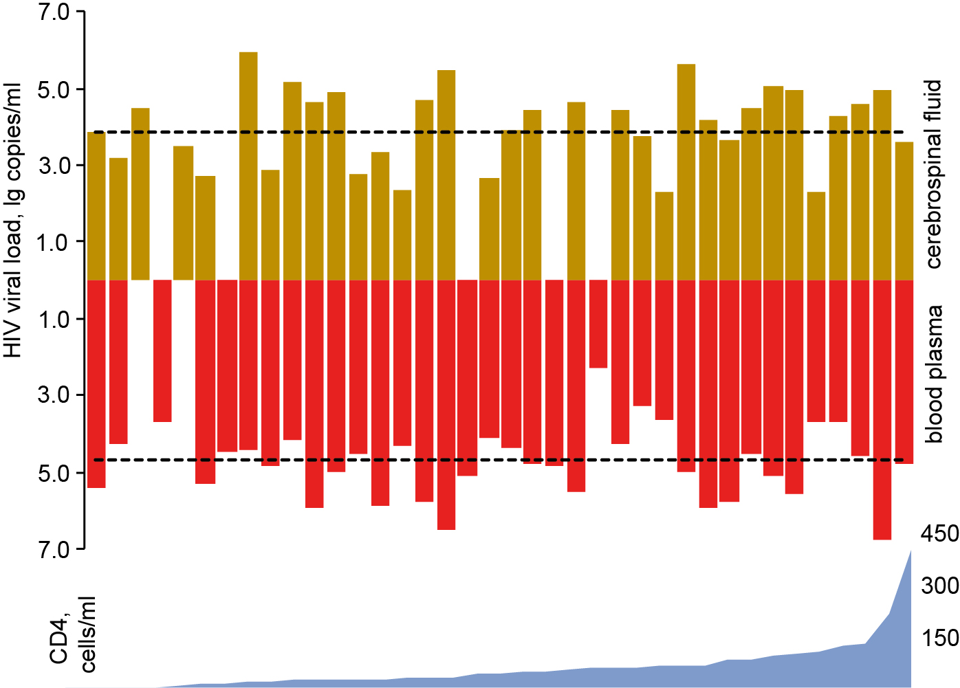 Fig. 2. HIV viral load in blood plasma and cerebrospinal fluid and an amount of CD4 cells among the examined patients (n = 38). The dotted line indicates the median.