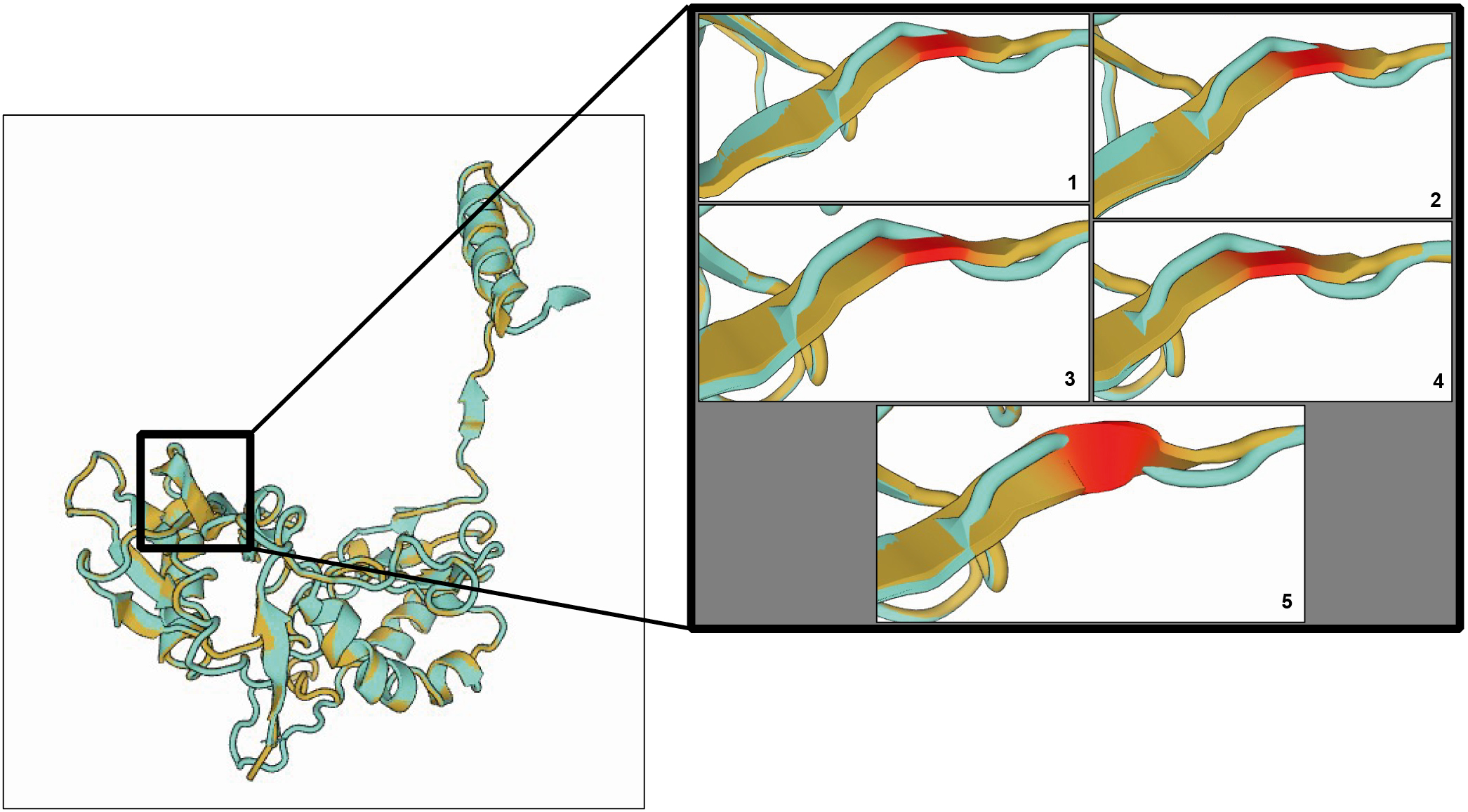 Fig. 5. Difference in the tertiary structure of HIV-1 reverse transcriptase p51 subunit between strains from blood plasma and from CSF. Amino acid positions 16–20 are framed. Strain from blood plasma is shown in cyan, from CSF — in light brown. Amino acid position 18 is highlighted in red.