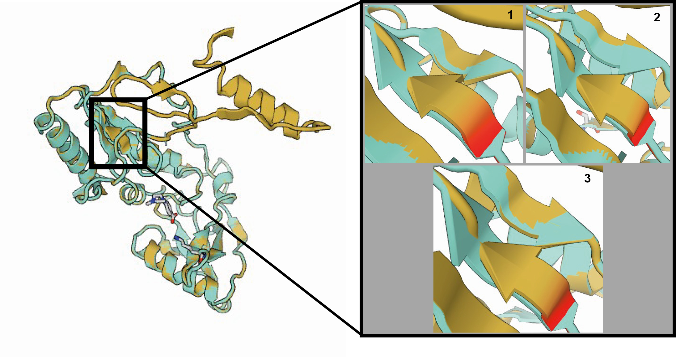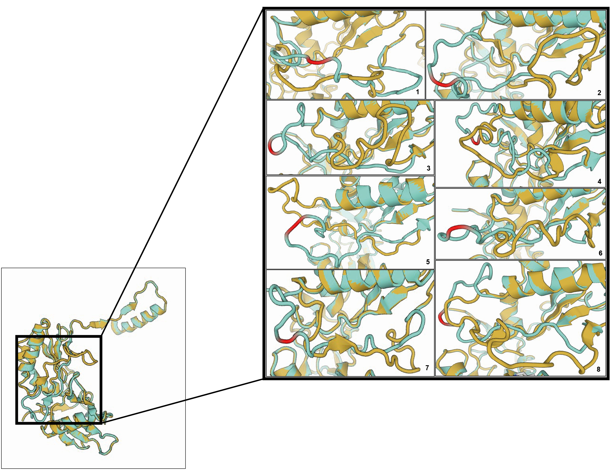 Fig. 7. Difference in the tertiary structure of HIV-1 reverse transcriptase p66 subunit between strains from blood plasma and from CSF. Amino acid positions 187–190 are framed. Strain from blood plasma is shown in cyan, from CSF — in light brown. Amino acid position 187 is highlighted in red.