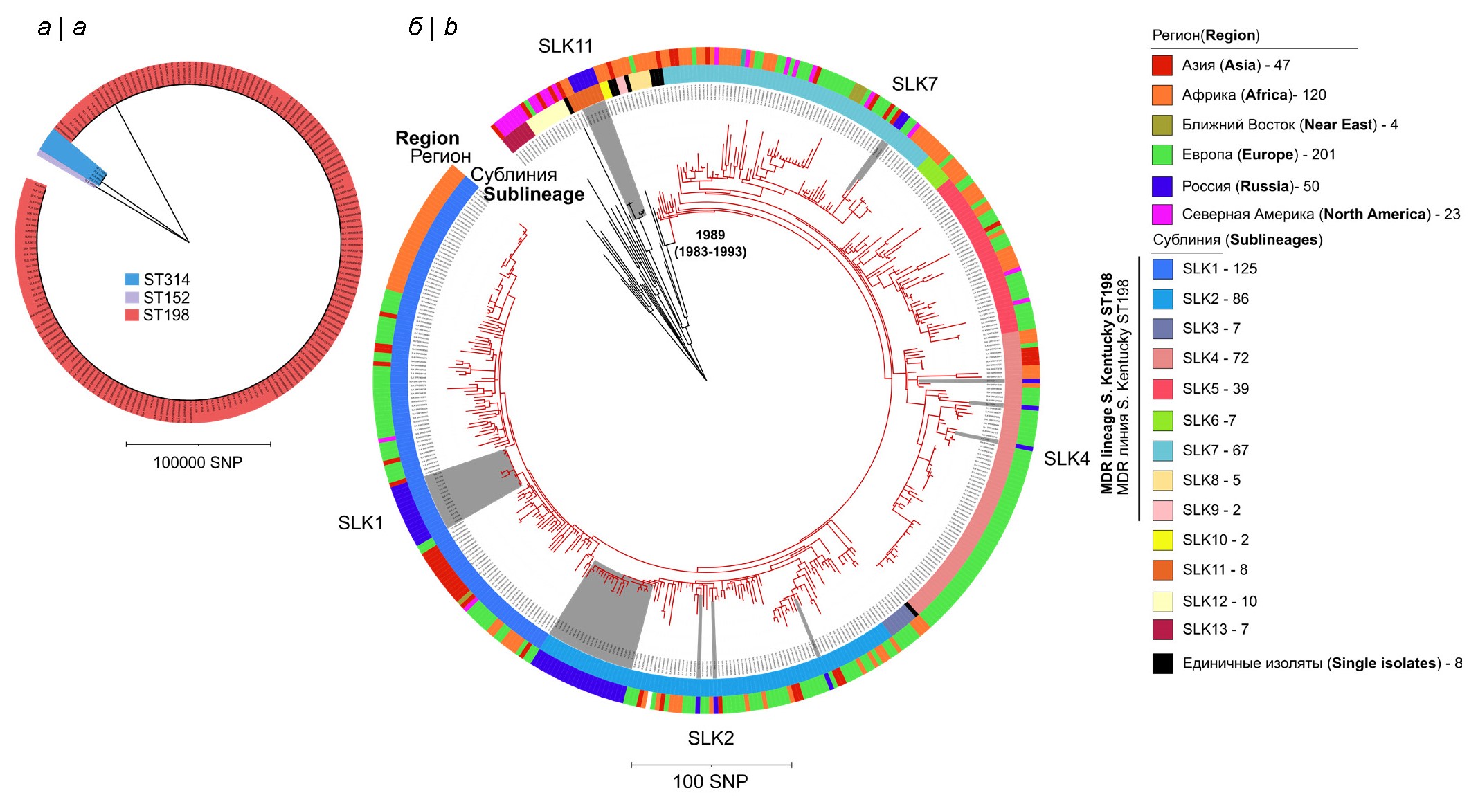 а — tree reconstructed based on SNPs of 173 S. Kentucky strains of sequence types ST314, ST152, and ST198. Strains belonging to individual sequence types belong to separate phylogenetic lineages with a high level of genetic divergence; b — maximum likelihood phylogenetic tree reconstructed based on SNPs of 445 S. Kentucky sequence-type ST198 strains. The genome of strain 98K (accession number SRR6898532), isolated in the USA in 1937 from chicken, was used as an outgroup. The clade shown in red indicates the MDR lineage S. Kentucky ST198, which includes nine sublineages SLK1-SLK9, identified in the Fastbaps program. The date of MDR lineage origin (1989 year) is indicated according to J. Hawkey et al., 2019 [5]. The outer sectors of different colors represent the geographic regions in which the strains were isolated. Gray sectors on the tree highlight 50 strains of S. Kentucky ST198 isolated in Russia.
