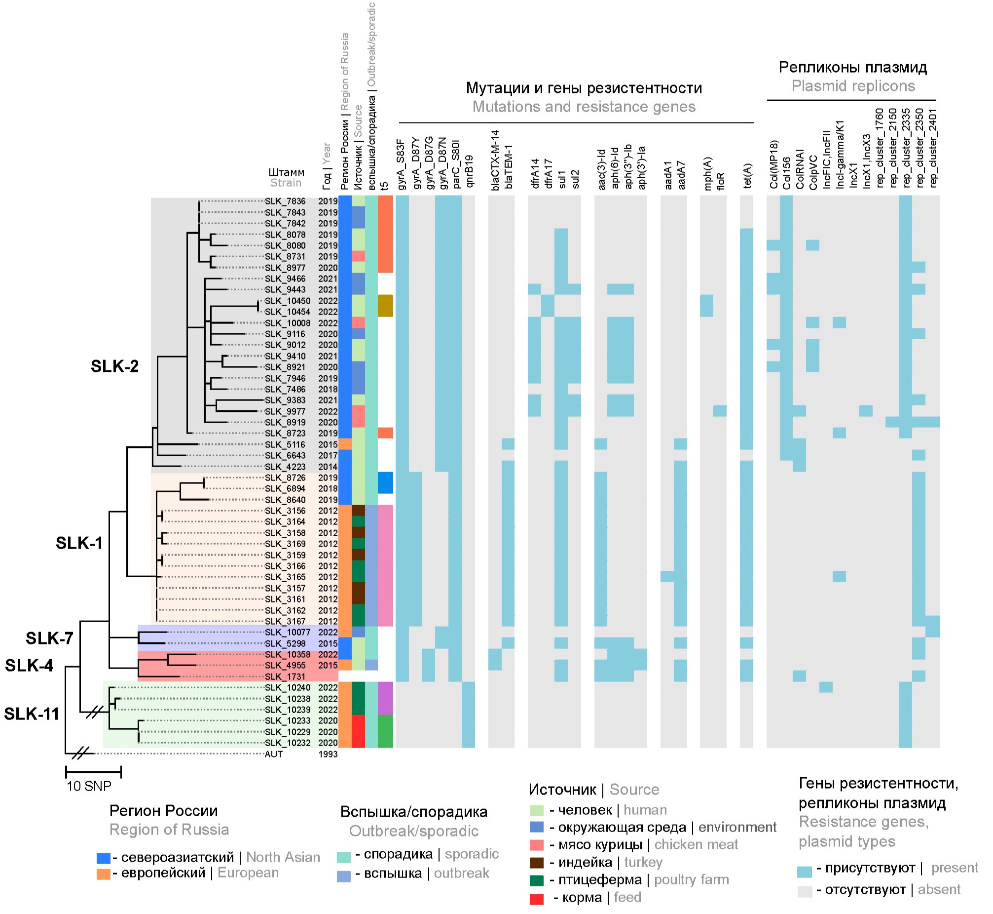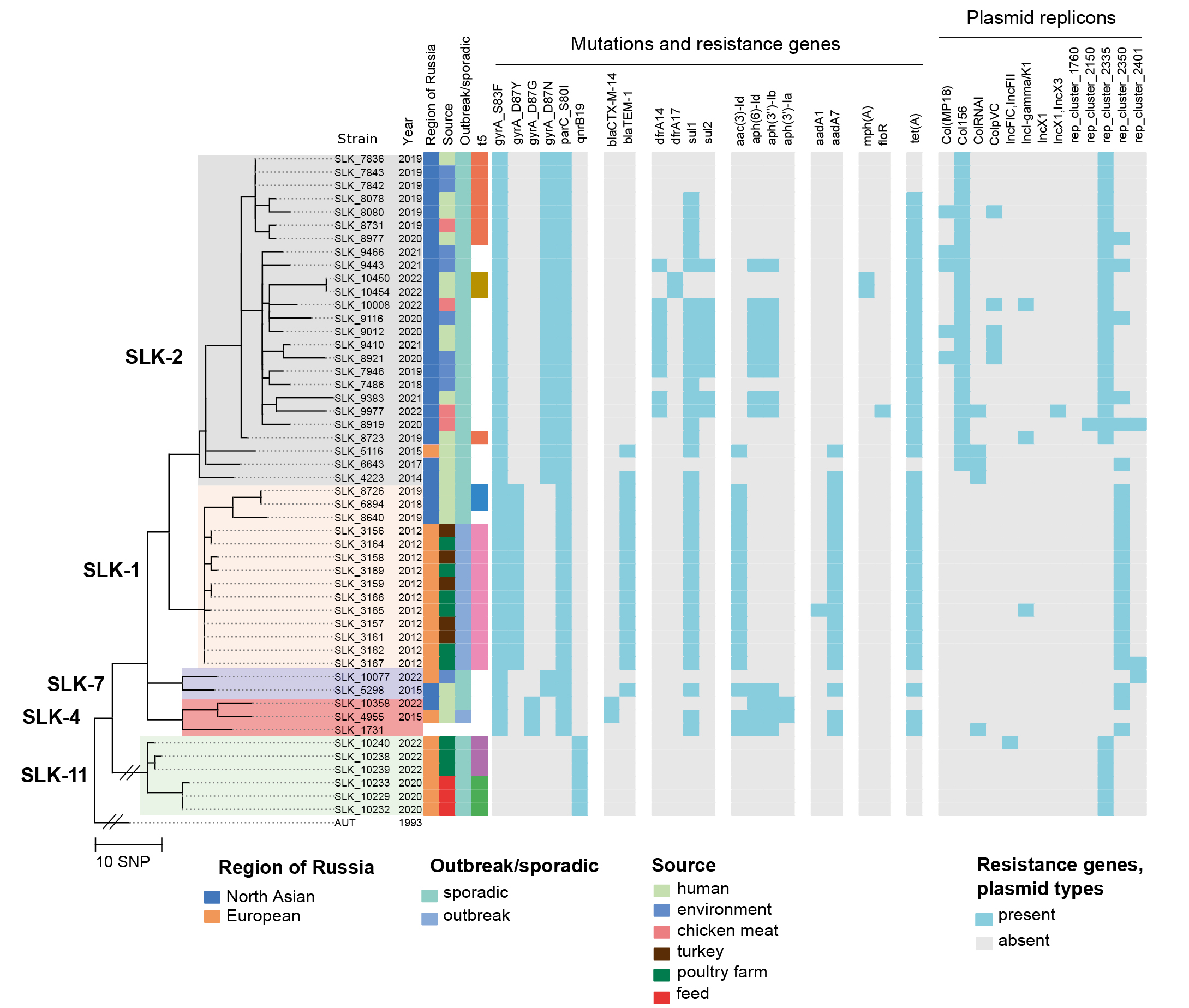 The aim of this study was to analyze S. Kentucky strains isolated from various sources in Russia in terms of their phylogenetic position within the global diversity of the pathogen and their genetic characteristics.