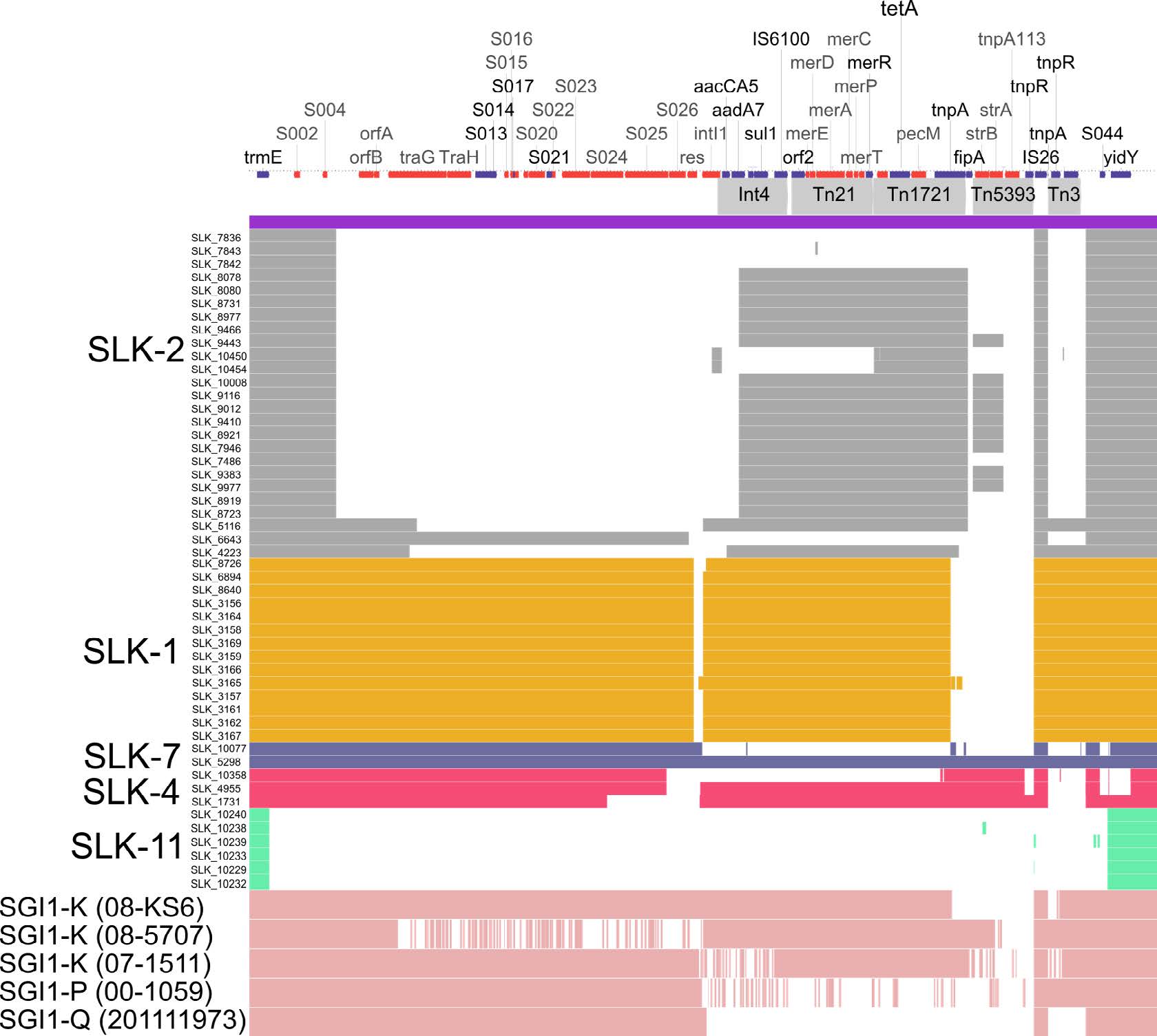 All SLK-1 sublineage strains had a similar composition of SGI1 island genes and 90% overlap of the SGI1-K reference sequence. The set of mobile elements, including Int4-Tn21-Tn1721-Tn3, was similar to the SGI1-K variant described previously in strain 08-KS6.
