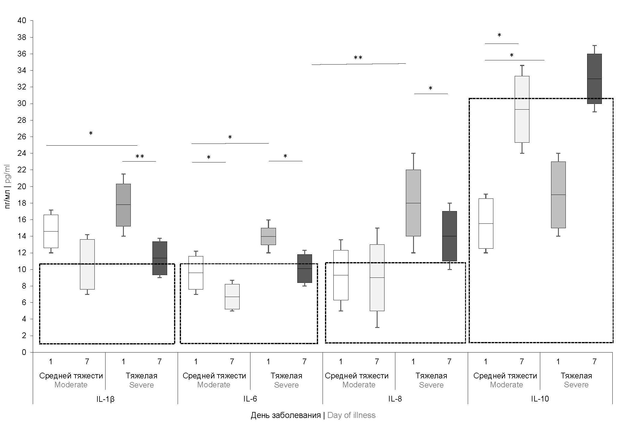 The regulatory cytokine IL-10 in all patients on the 1st day of the disease did not exceed the reference values. At the same time, on the 7th day, this indicator significantly exceeded reference level in patients with severe campylobacteriosis, which can be explained by a compensatory reaction of the body aimed at preventing the development of allergic and autoimmune processes.