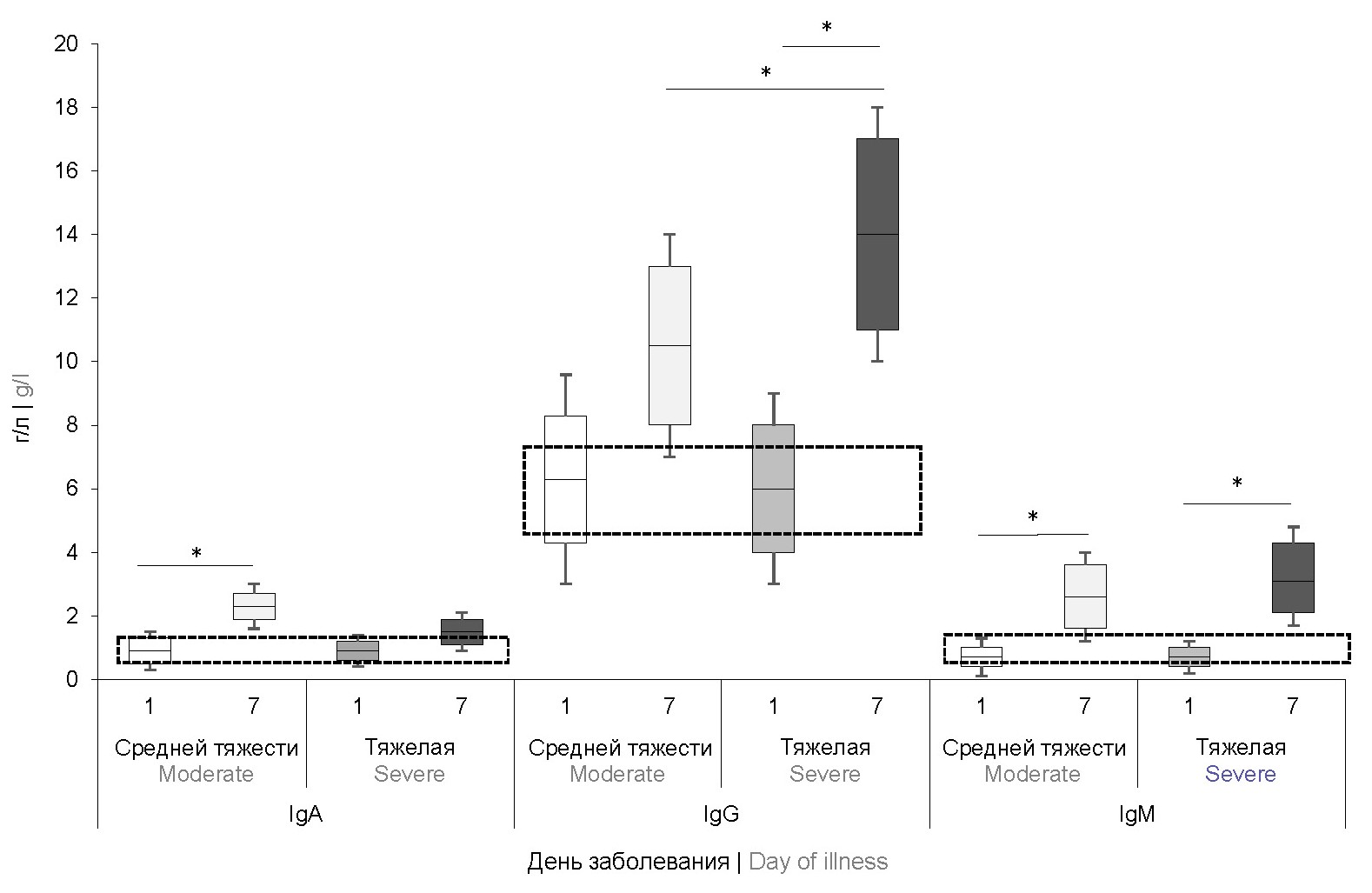 A study of the concentrations of Ig, IgM and IgG on the 1st day of the disease showed that, regardless of the severity of the infection, they were within the reference values. By day 7, there was an increase in the average level of immunoglobulins, statistically significant for IgA and IgM (p = 0.003 and p = 0.021, respectively). Both classes of immunoglobulins are produced during the acute period of the immune response, which appear in the blood upon first contact with infection.