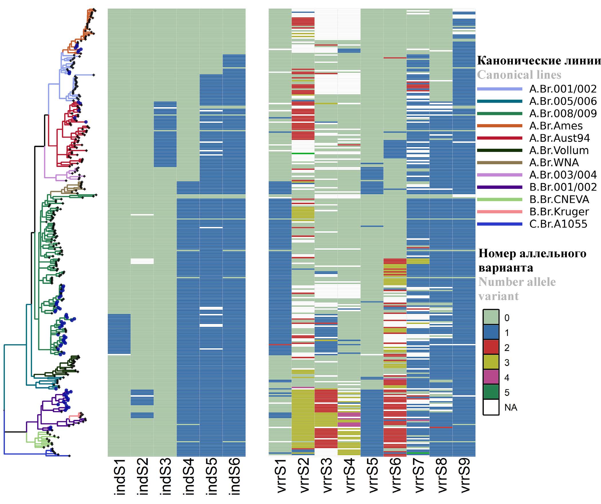 As a result of clustering based on the INDEL typing, strains were divided into 6 clusters: A.Br.Ames, A.Br.001/002, A.Br.Aust94, A.Br.008/009 (Tsiankovskii), B.Br.001/002 (B.Br.014), as well as a cluster including representatives of several genetic groups: A.Br.008/009 (STI), A.Br.008/009 (A.Br.125), A.Br.005/006 and B.Br.001/002. The cluster is singled out as a separate group because no specific INDEL markers have been identified for the strains of these lineages (Fig. 4).