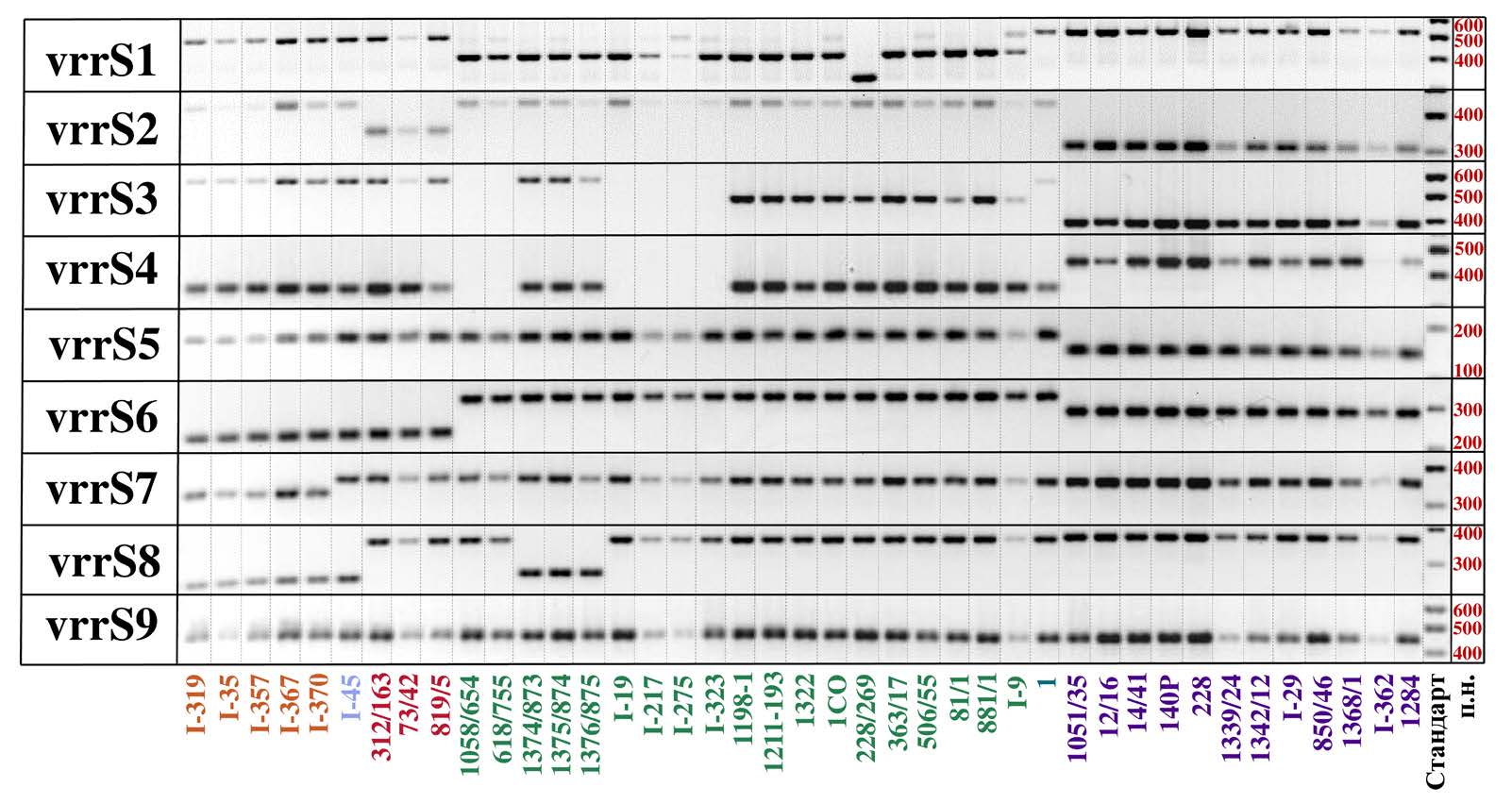 A representative phylogenetic sample of sequenced strains was used for verification of data obtained by PCR with electrophoretic detection. PCR was performed using the ScreenMix-HS kit (Eurogen). The amount of primers in the reaction was equal to 0.3 μM. The following thermocycling mode was used: the first stage (activation) — 95ºС, 5 min — 1 cycle, the second stage — denaturation 95ºС, 20 s, annealing 60ºС, 20 s, elongation 72ºС, 60 s — 40 cycles, the third stage (final elongation) — 72ºС, 5 min — 1 cycle. Electrophoresis was performed in 2% agarose gel using a 100 bp molecular weight marker (SibEnzyme).