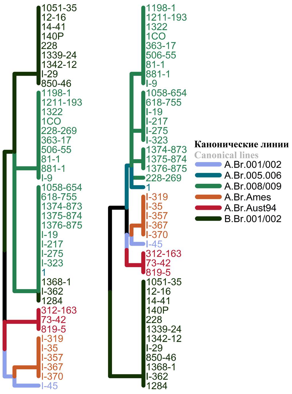 Taking into account the established and newly identified designations of genetic lineages and groups, we used the following order in the subsequent description. The canonical lineage is indicated first, followed by a new subgroup or cluster within it with an established designation, if identified. For example, most strains of the main lineage A, isolated in Russia, are designated as A.Br.008/009 (Tsiankovskii) or A.Br.008/009 (STI).