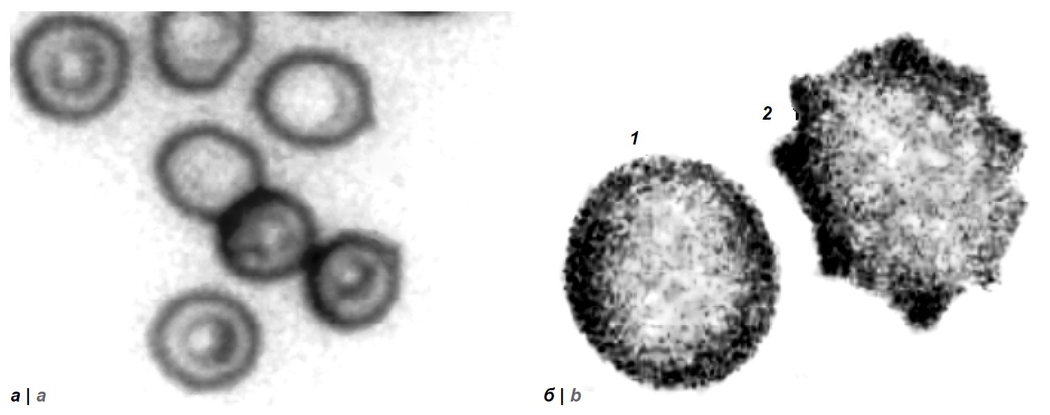 Эритроциты интактных морских свинок при наблюдении в световом микроскопе в стандартном режиме светлого поля представляли собой оптически контрастные объекты округлой формы (рис. 1, а). В ответ на иммунизацию морских свинок штаммами Y. pestis в крови происходило изменение формы и размеров эритроцитов, появлялись эритроциты трансформированной формы (эхиноциты (рис. 1, б), сфероциты, кодоциты).