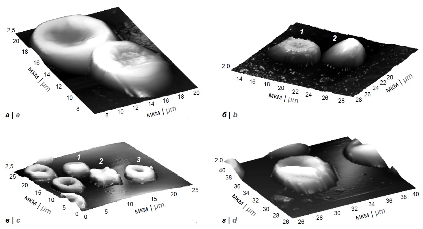 а — discocytes, 20 × 20 µm2; b: 1 — echinocyte, 2 — spherocyte, 15 × 15 µm2; c: 1 — codocyte, 2 — echinocyte, 3 — discocyte, 25 × 25 µm2; d — codocyte, 15 × 15 µm2.