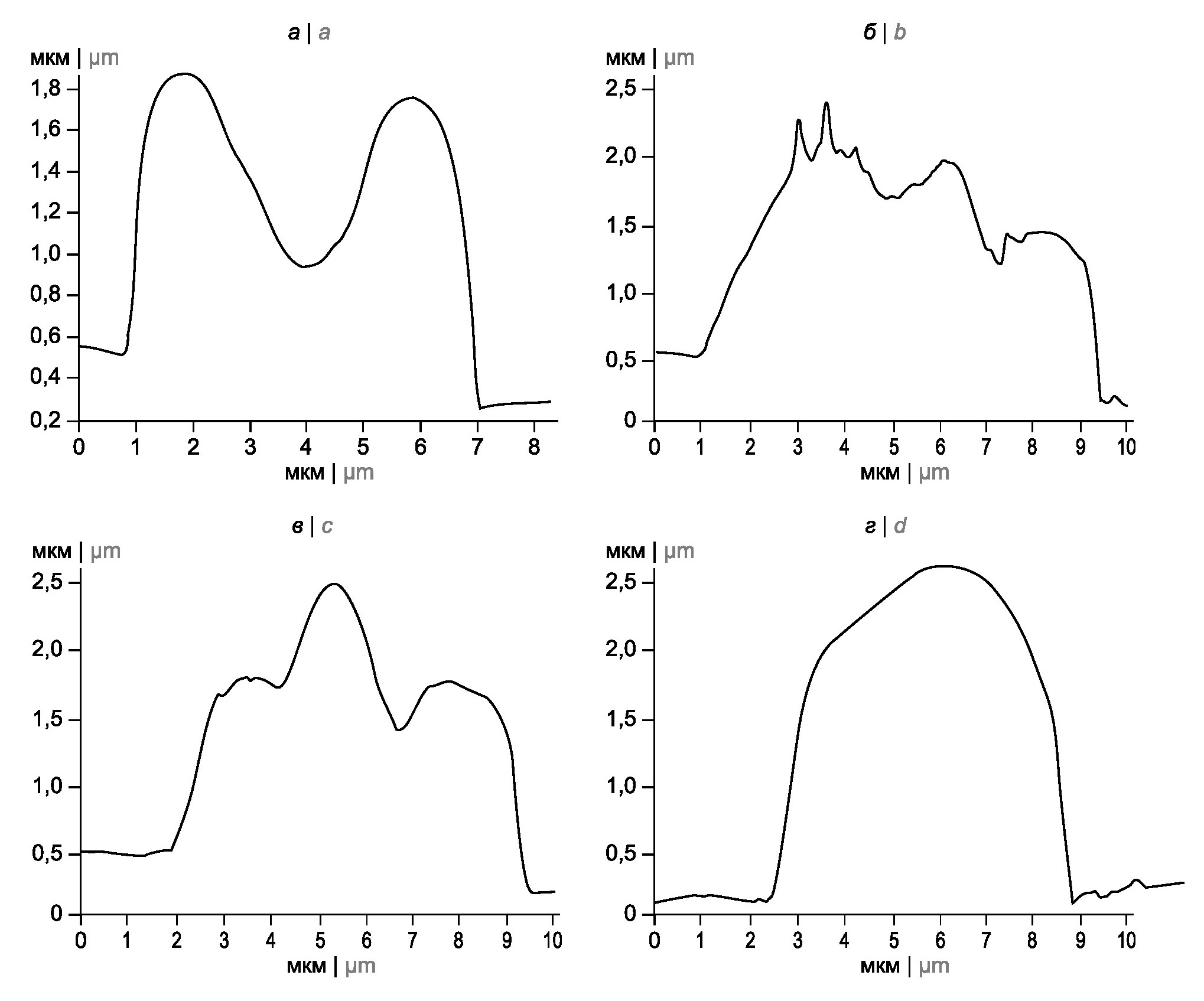 Атипичные формы клеток, которые появлялись в результате воздействия штаммов Y. pestis, — это эхиноциты (рис. 2, б, в), сфероциты (рис. 2, б), кодоциты (рис. 2, г) и плоские клетки. Анализ гистограмм нормальных эритроцитов и трансформированных форм (ТФ) показал, что у неизменённых форм типичный двояковогнутый профиль клетки на кривой сечения представлен двумя равномерными синусоидами (рис. 3, а), в то время как у ТФ были выявлены выраженные изменения структуры мембранной поверхности. Любое нарушение в рельефе эритроцита отражалось на изменении профиля клетки, представленного в гистограммах (рис. 3, бг).
