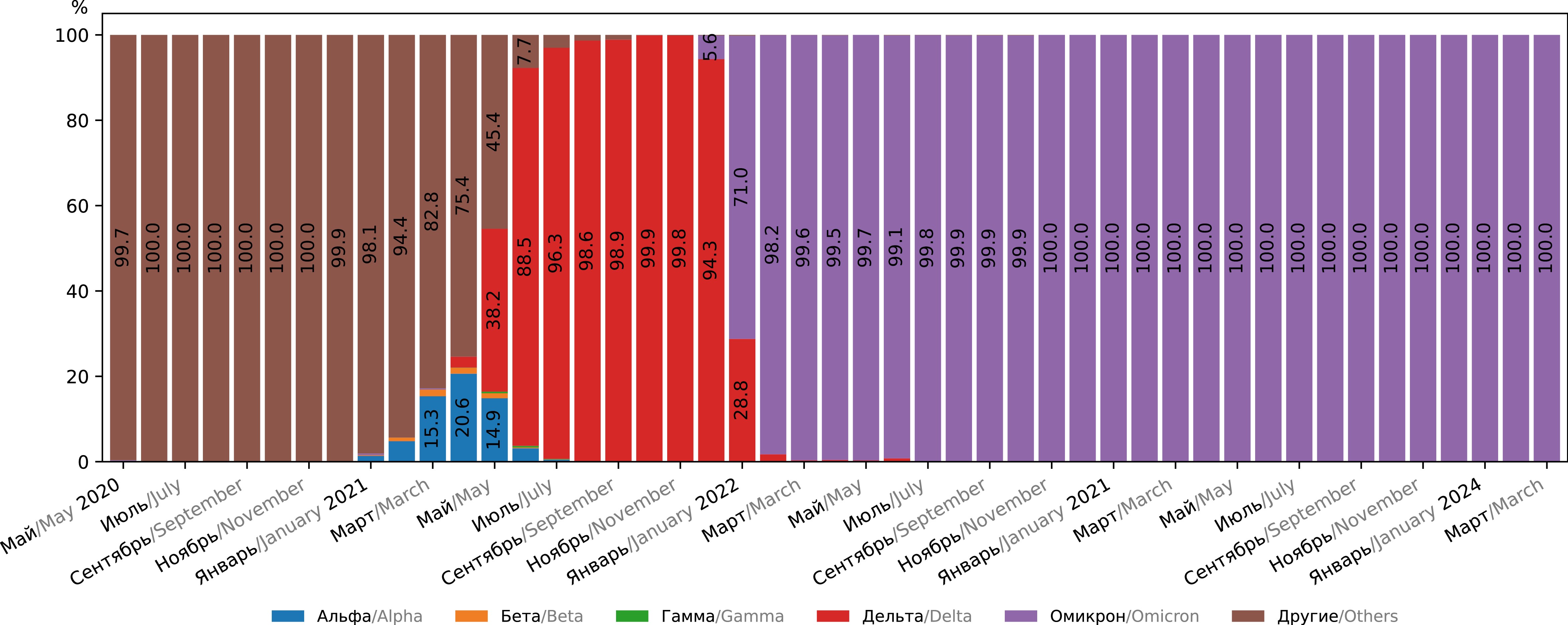 Fig. 2. A diagram illustrating the occurrence of significant SARS-CoV-2 variants of concern in the Russian Federation throughout 2020 until the March of 2024.