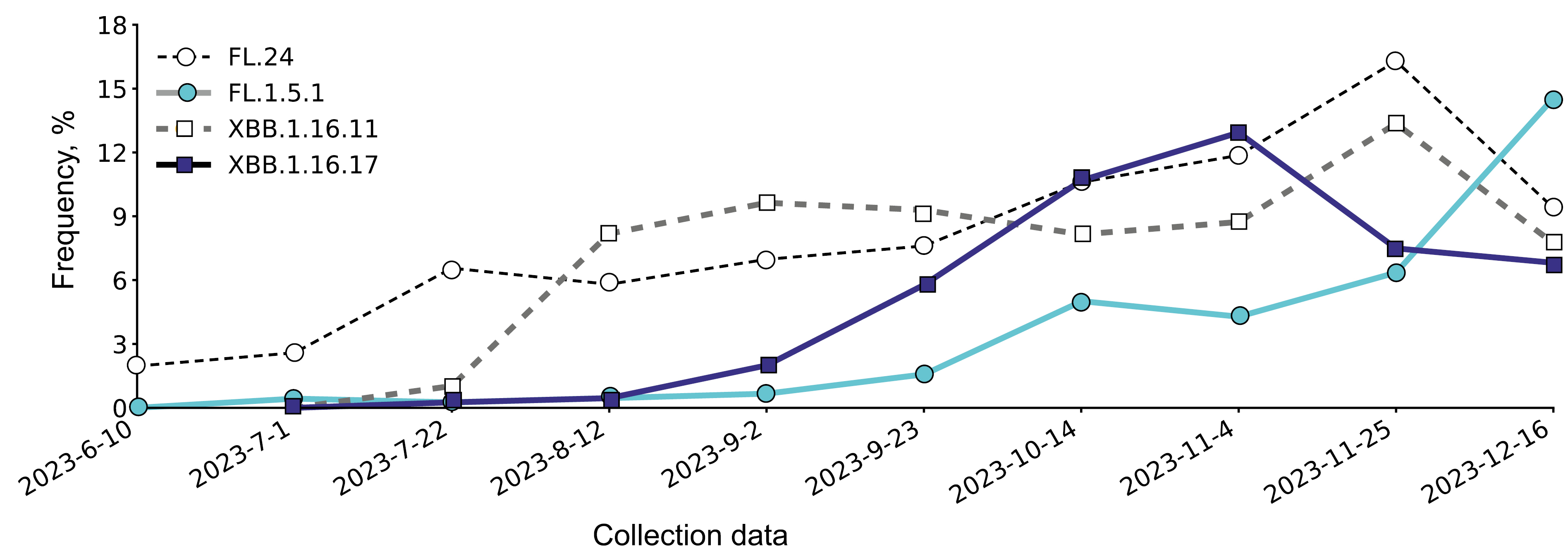 Studying the spreading dynamics of these lineages with time can potentially help predict the evolution of SARS-CoV-2. For this reason, the frequency dynamics for several of the discussed sublineages from June through December 2023 are presented in Figure 6. Lineages XBB.1.9.1 and XBB.1.16 were intentionally excluded from this analysis due to the decreasing or static nature of their frequency trend during the period under consideration. The former line significantly decreased its prevalence to almost zero, while the latter line did not change its frequency, remaining between 6–16%. Consequently, they are not considered potentially future dominant lineages.