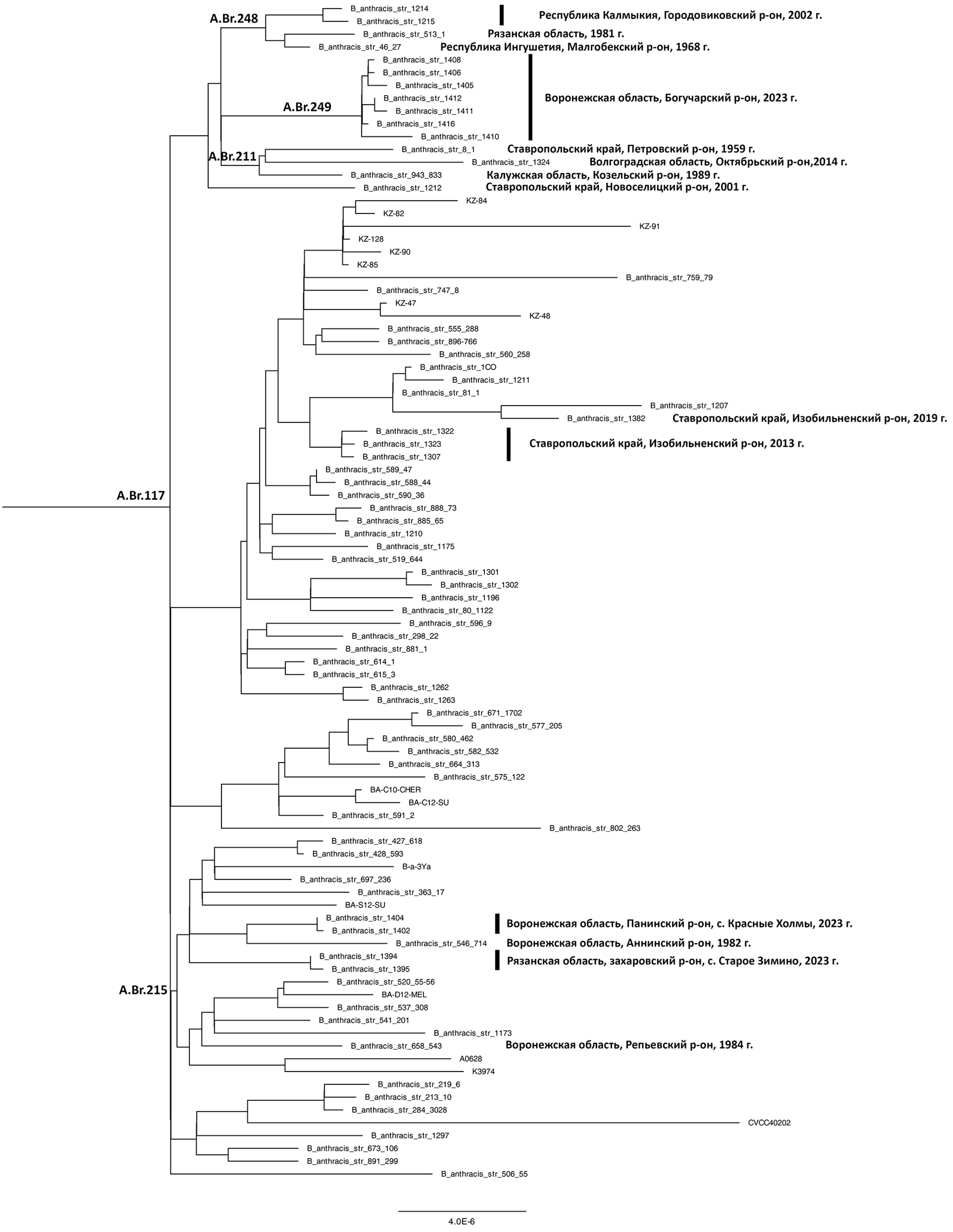 Штаммы, изолированные в Богучарском районе Воронежской области, также относятся к линии A.Br.117 (Tsiankovskii) и кластеризуются со штаммами, выделенным в Ставропольском крае (Петровский район — 1959 г., Новоселицкий район — 2001 г.), Волгоградской области (Октябрьский район, 2014 г.), Калужской области (Козельский район, 1989 г.), Республике Ингушетия (Малгобекский район, 1968 г.), Рязанской области (1981 г.), Республике Калмыкия (Городовиковский район, 2002 г.) (рис. 2).
