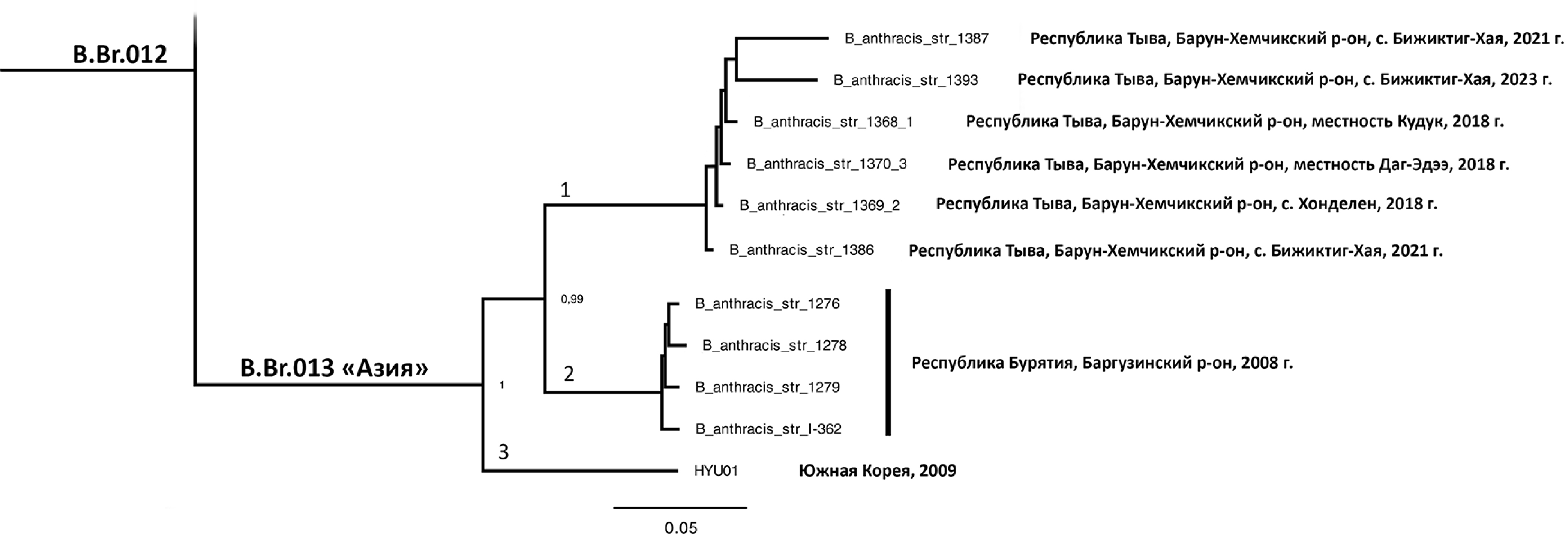 Культура, выделенная в Барун-Хемчикском районе Республики Тыва, принадлежит к кластеру B.Br.013 «Азия» линии B.Br.012 и имеет близкое филогенетическое родство со штаммами, выделенными в этом же районе республики в 2018 и 2021 гг. (субкластер 1 на рис. 3).