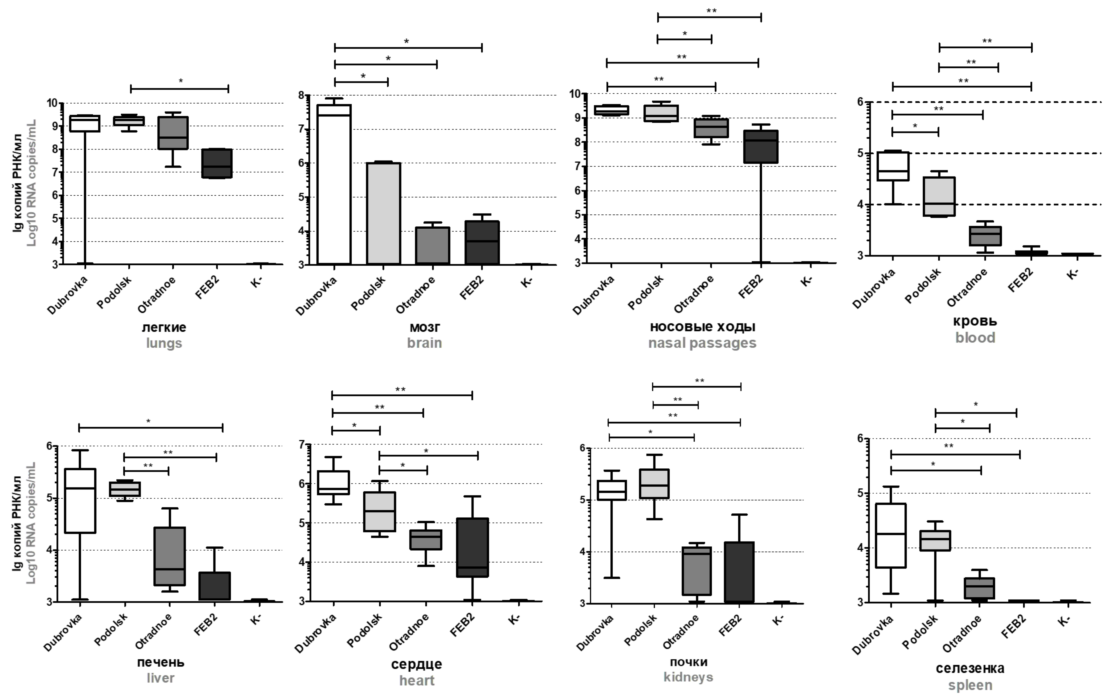 Fig. 6. Distribution of viral RNA in the organs of hamsters infected with different SARS-CoV-2 strains. *р < 0.05; **р < 0.01.