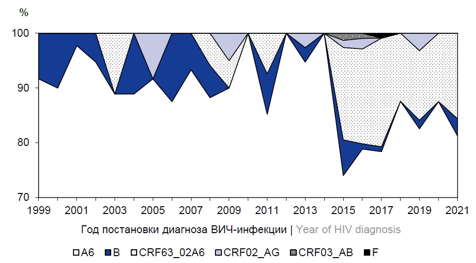Доминирующим генетическим вариантом ВИЧ-1 был суб-субтип А6, он обнаружен у 85,7% ВИЧ-инфицированных. С высокой частотой выявлялась циркулирующая рекомбинантная форма (CRF) 63_02A6 (10,6%), распространённость которой увеличилась среди исследуемых пациентов, которым поставили диагноз «ВИЧ-инфекция», в 2015–2021 гг. (рис. 1). Остальные генетические варианты ВИЧ-1 встречались значительно реже: субтип B — 2,4%; CRF02_AG — 1,0%; CRF03_A6B — 0,2%; субтип F — 0,1%.