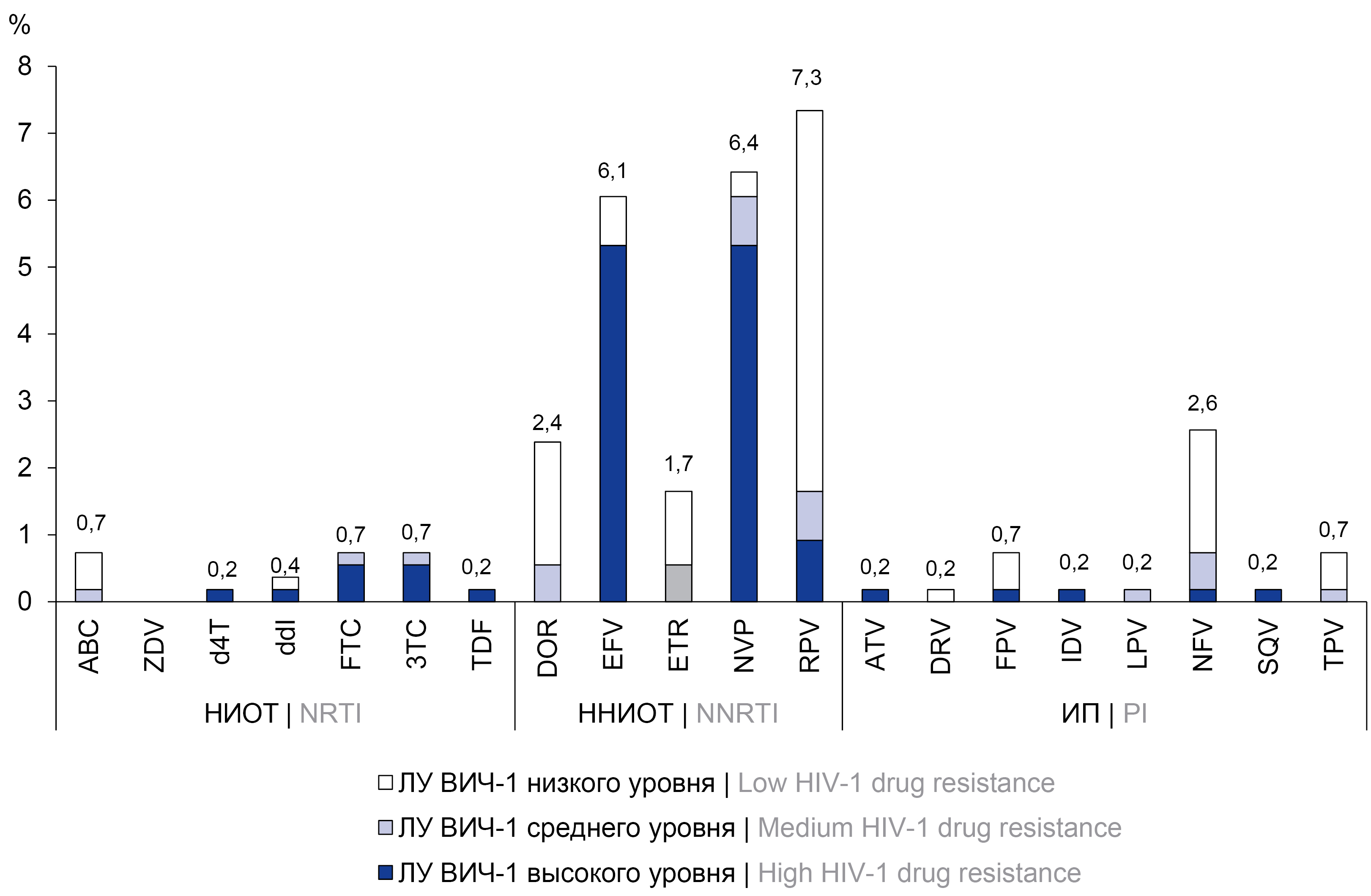 Среди класса ННИОТ ЛУ ВИЧ-1 была обнаружена чаще всего к RPV (7,3%), NVP (6,4%) и EFV (6,1%), причём к препаратам 1-го поколения преимущественно высокого уровня (рис. 2). Среди ИП ЛУ ВИЧ-1 чаще всего была выявлена к NFV (2,6%). Среди препаратов класса НИОТ резистентность ВИЧ-1 была определена наиболее часто к ABC (0,7%), FTC (0,7%) и 3TC (0,7%).
