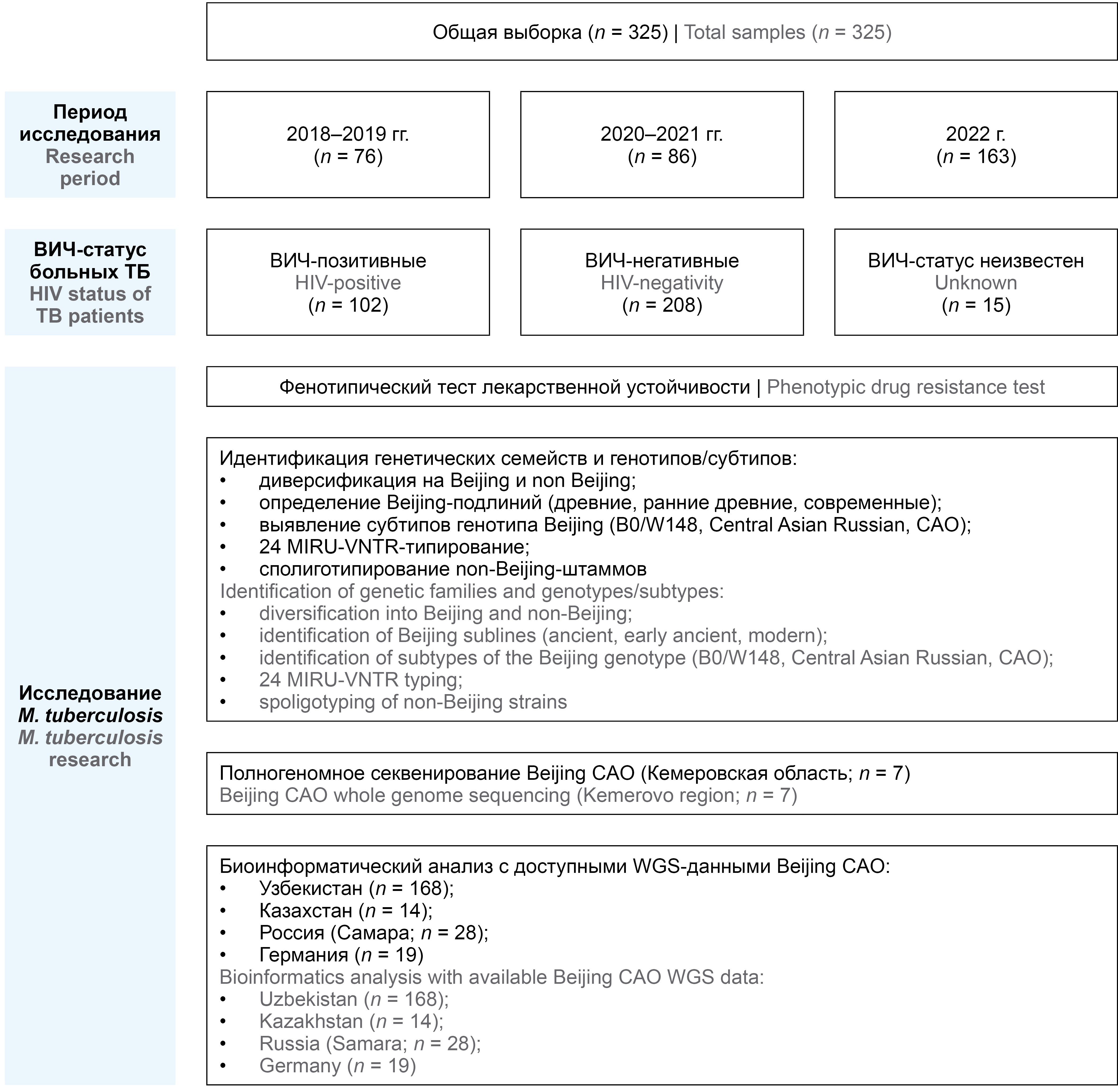 Исследовано 325 клинических изолятов M. tuberculosis от больных ТБ из Кемеровской области — Кузбасса: из 2 сплошных скрининговых исследований в 2020–2021 гг. (n = 86) и 2022 г. (n = 163); из криоколлекции 2018–2019 гг. (n = 76) Новосибирского НИИ туберкулёза, являющегося референс-центром по контролю ТБ в Сибири и на Дальнем Востоке России (рис. 1).