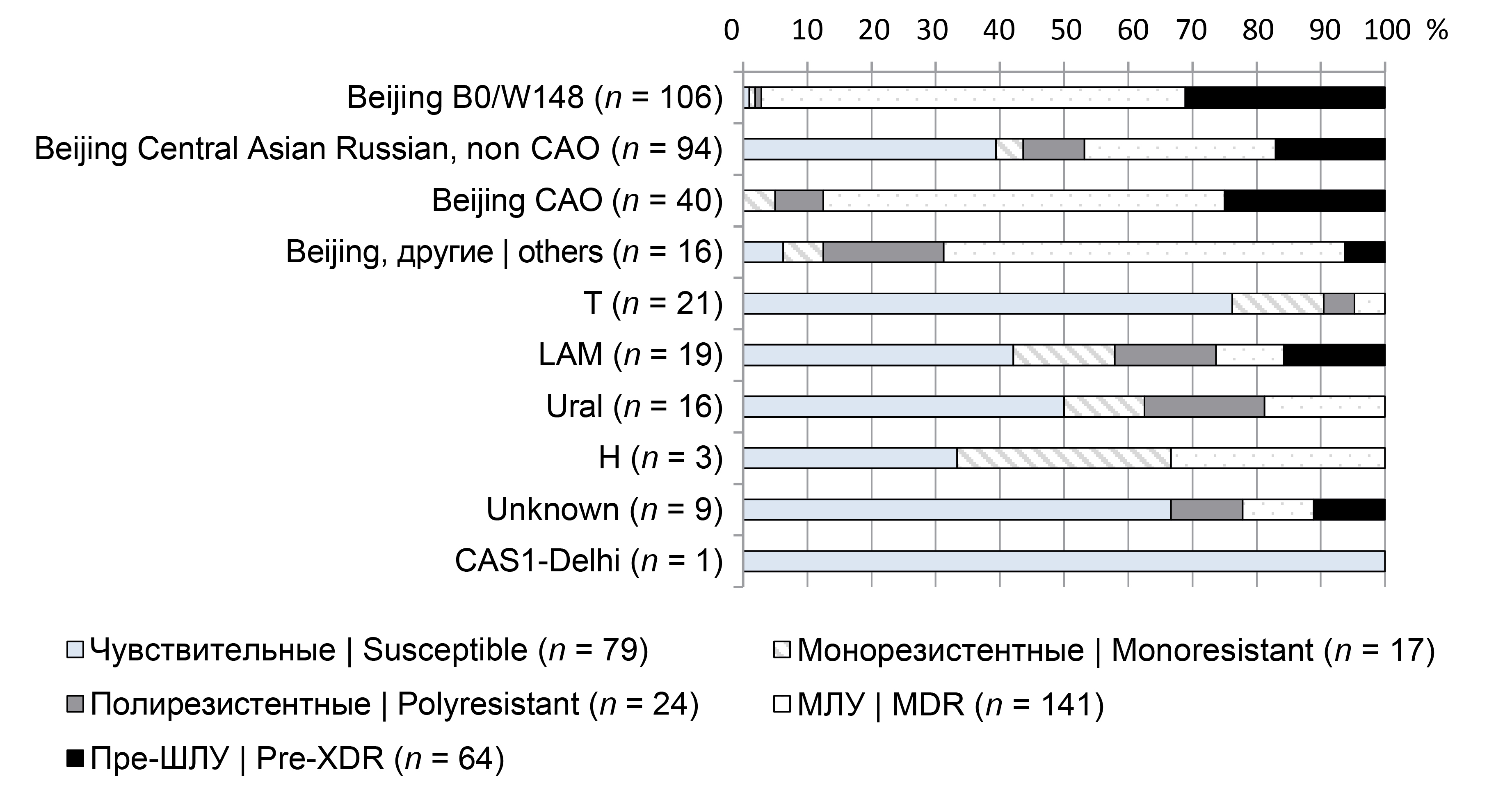 Заключение. В популяции M. tuberculosis выявлен высокий уровень МЛУ и пре-ШЛУ у штаммов Beijing, в особенности субтипов B0/W148 (97,2%) и САО (87,5%). Штаммы Beijing САО, выявленные преимущественно у впервые выявленных больных ВИЧ/ТБ, требуют дальнейшего наблюдения и контроля их распространения.