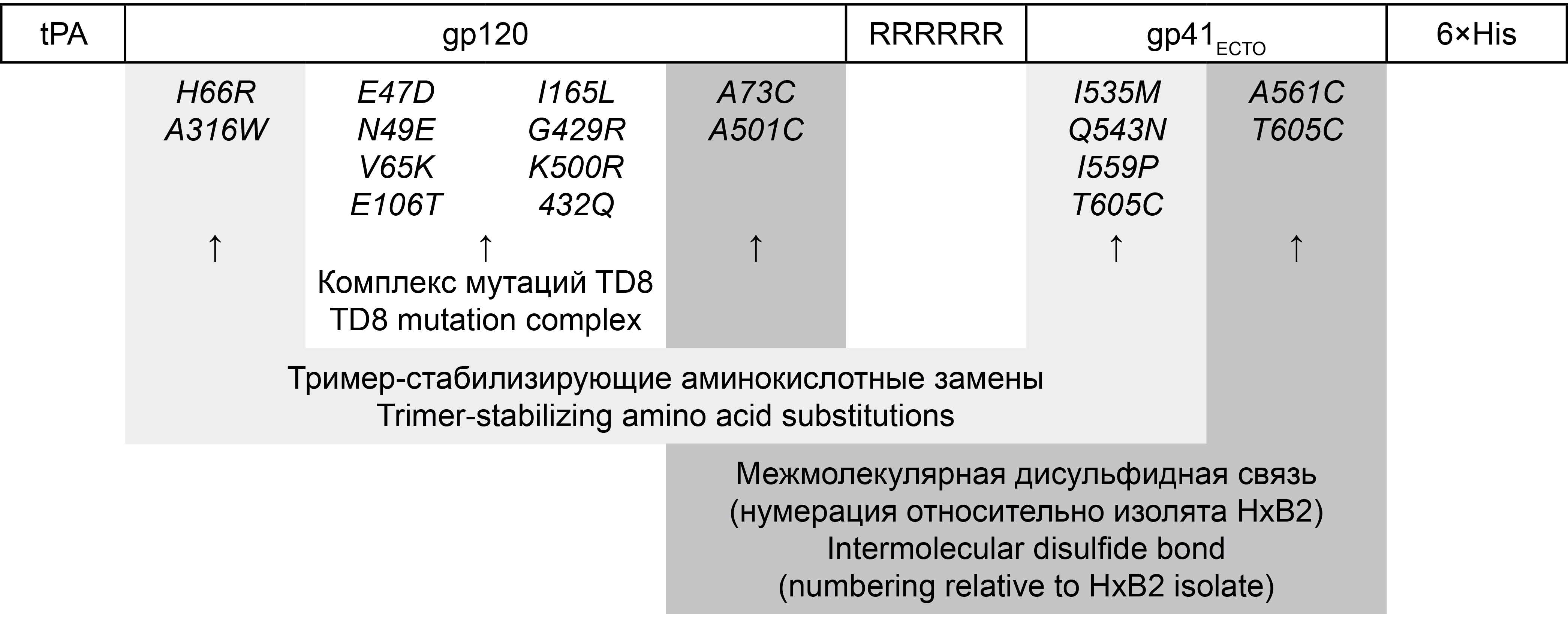 В данной работе для дизайна использовали охарактеризованный ген env 22RUAR13, который относится к актуальной рекомбинантной форме CRF63_02A6 ВИЧ-1, циркулирующей в настоящее время в Сибирском регионе. Для улучшения образования растворимых тримеров конструкция содержала следующие изменения по сравнению с природной последовательностью: природный сигнальный пептид заменяли на сигнальную последовательность tPA (tissue plasminogen activator signal peptide); вводили 2 цистеина для формирования дисульфидной связи gp120-gp41 (501C и 605C); вносили стабилизирующие аминокислотные замены в gp41 (I559P, H66R и A316W); для улучшенной тримеризации вносили аминокислотные замены в gp41 (I535M и Q543N) и комплекс мутаций TD8 (E47D, N49E, V65K, E106T, I165L, G429R и K500R; 432Q); для усиления расщепления мотив REKR в gp120 заменяли на RRRRRR (R6); также удаляли MPER-область, трансмембранный и цитоплазматический домены для лучшей экспрессии проектируемого белка; после аминокислотного остатка 664 на C-конце добавляли 6×His для последующей очистки [6] (рис. 1). Полученный вариант тримера Env рекомбинантной формы CRF63_02A6 обозначили как gp140.SOSIP.664.opt.