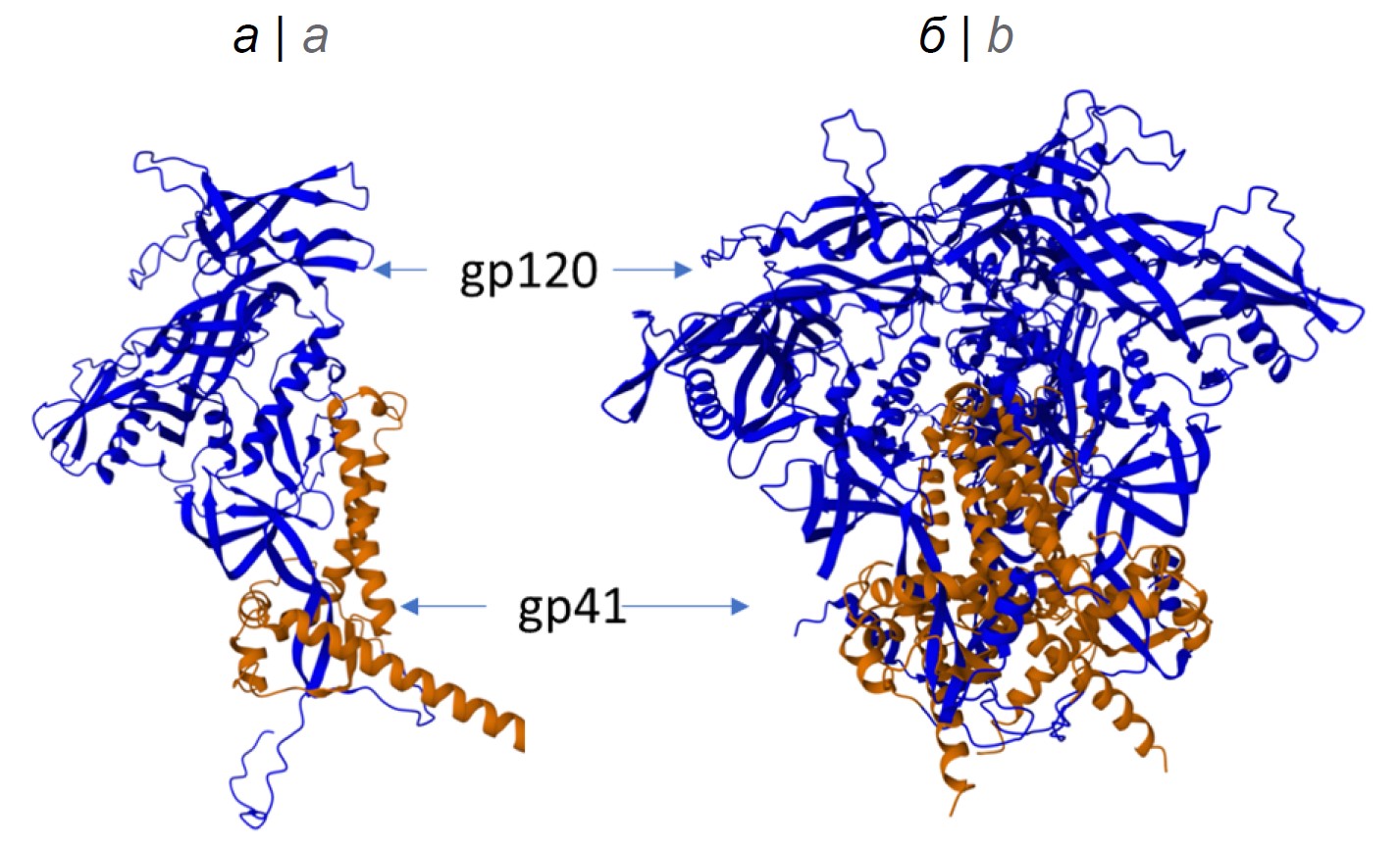 В данной работе с использованием биоинформатических ресурсов проведён дизайн тримера Env gp140.SOSIP.664.opt рекомбинантной формы CRF63_02A6, в структуру которого, наряду с дисульфидной связью SOS (A501C-T605C) и аминокислотной заменой I559P, были введены дополнительные аминокислотные замены и комплекс мутаций TD8 в gp120, приводящие к дополнительной стабилизации белкового комплекса [6]. В результате получен оптимизированный стабилизированный тример Env CRF63_02A6 ВИЧ-1. Компьютерное моделирование с помощью «Alphafold2» показало, что спроектированная аминокислотная последовательность способна сворачиваться в мономеры и тримерные комплексы (рис. 1, б).