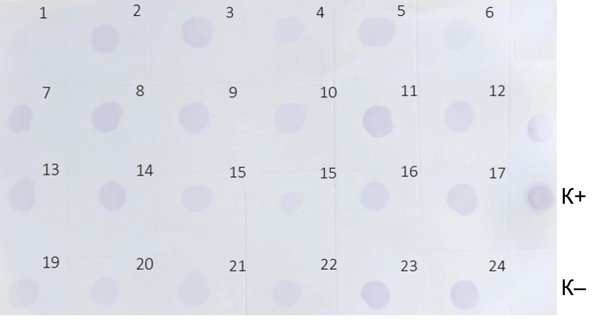 Далее путём трансфекции клеточной линии CHO-K1 была получена поликлональная клеточная культура CHO-K1-gp140.SOSIP.664.opt, которую использовали для выделения моноклональных клеточных линий методом предельного разведения. В итоге были получены 24 моноклональные культуры, которые с помощью дот-блот-анализа исследовали на способность продуцировать целевой белок в культуральную среду. В результате была определена моноклональная культура (№ 11) с высокой экспрессией трансгена (рис. 3), которую использовали для дальнейшей работы.