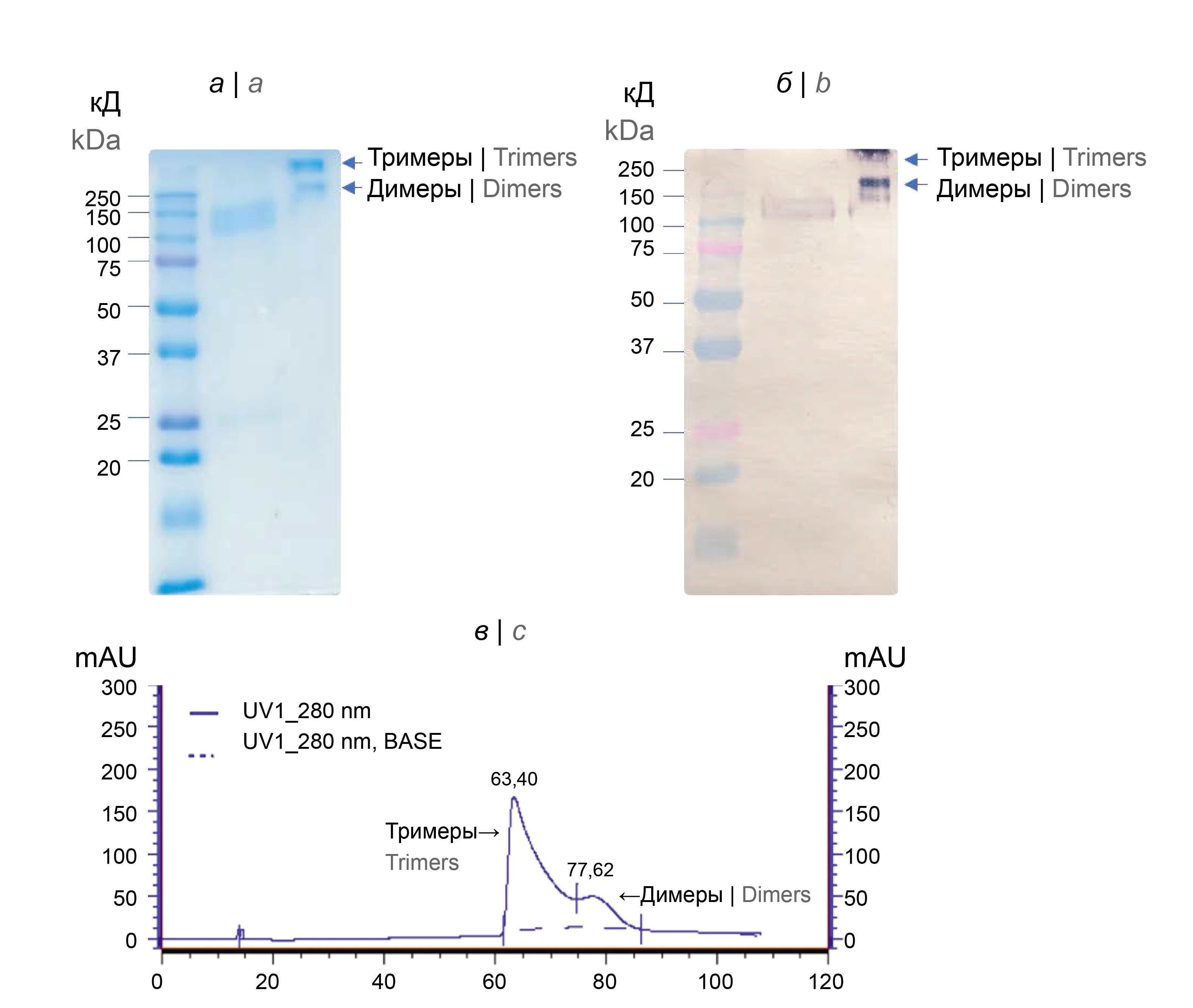 С помощью электрофореза в ПААГ и вестерн-блот-анализа установлено, что в присутствии β-меркаптоэтанола очищенный тример Env CRF63_02A6 ВИЧ-1 денатурирует до мономера (молекулярная масса ~140 кДа; рис. 4, а), который специфически распознаётся bnAb PGT126 (рис. 4, б). В отсутствие β-меркаптоэтанола фракция мономера отсутствует, что свидетельствует о стремлении белка собираться в более крупные структуры (рис. 4, а). С помощью гель-фильтрации выявлено, что белок в растворе находится преимущественно в тримерной форме (рис. 4, в).