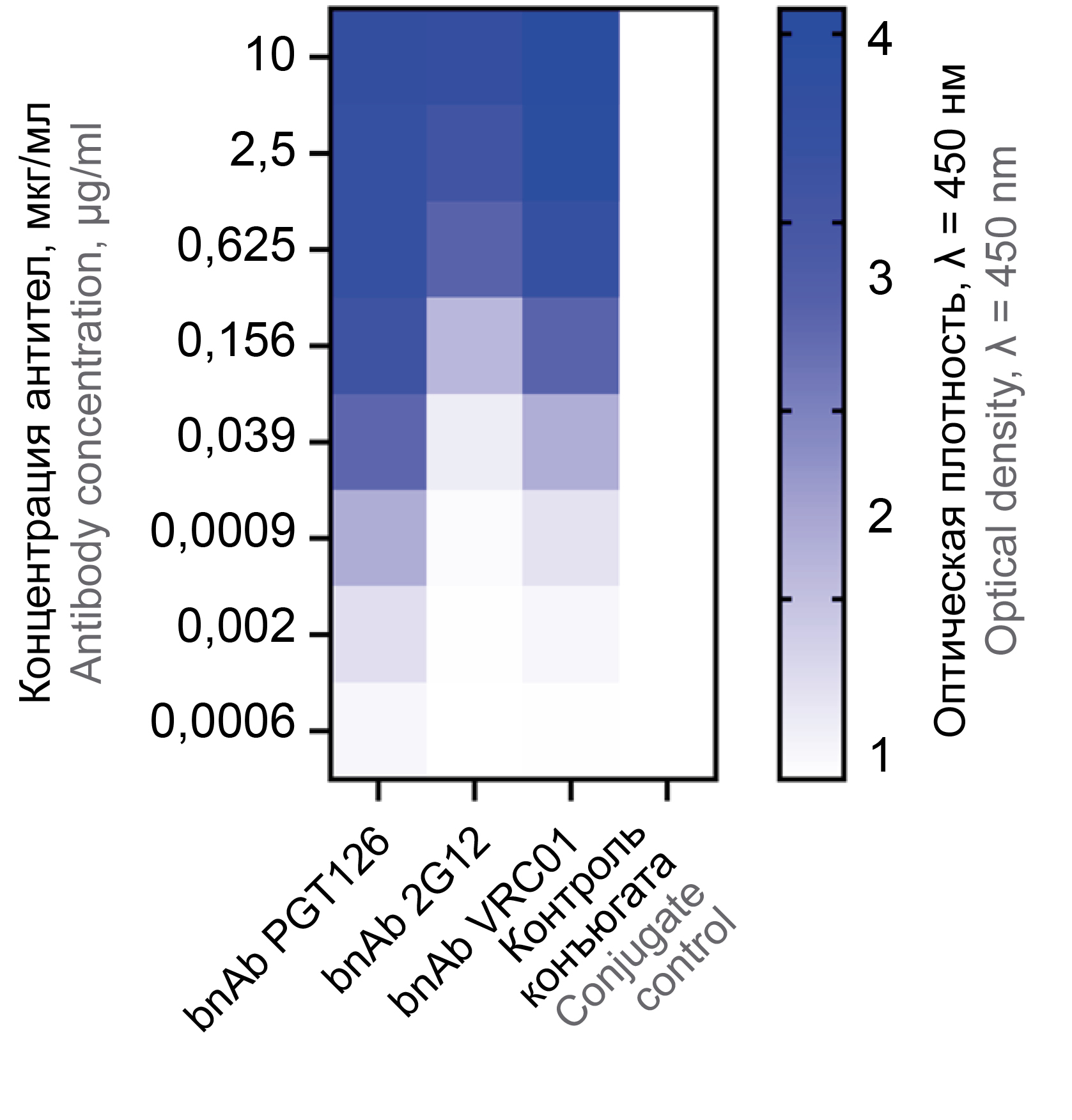 Иммуноферментный анализ проводили по стандартной методике. В качестве первичных антител использовали bnAbs PGT126, 2G12, VRC01, в качестве вторичных — антитела козы против IgG человека, меченные пероксидазой хрена («Sigma»). В качестве хромогенного субстрата применяли раствор тетраметилбензидина («Имтэк»). Реакцию останавливали 1 Н раствором соляной кислоты. Оптическую плотность измеряли на приборе «Varioskan LUX» («Thermo Scientific») при длине волны 450 нм.