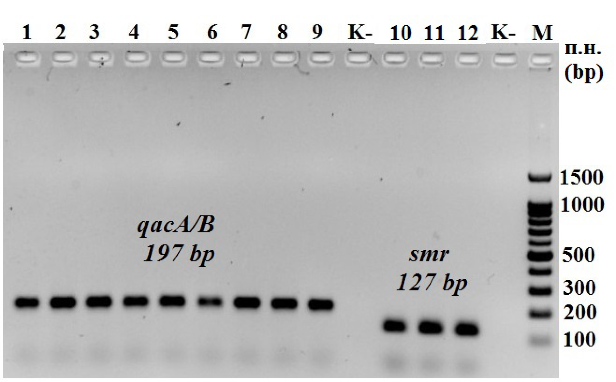 1–9 — qacA/B-positive isolates; 10–12 — smr-positive isolates. С– — negative control. M — DNA length marker.