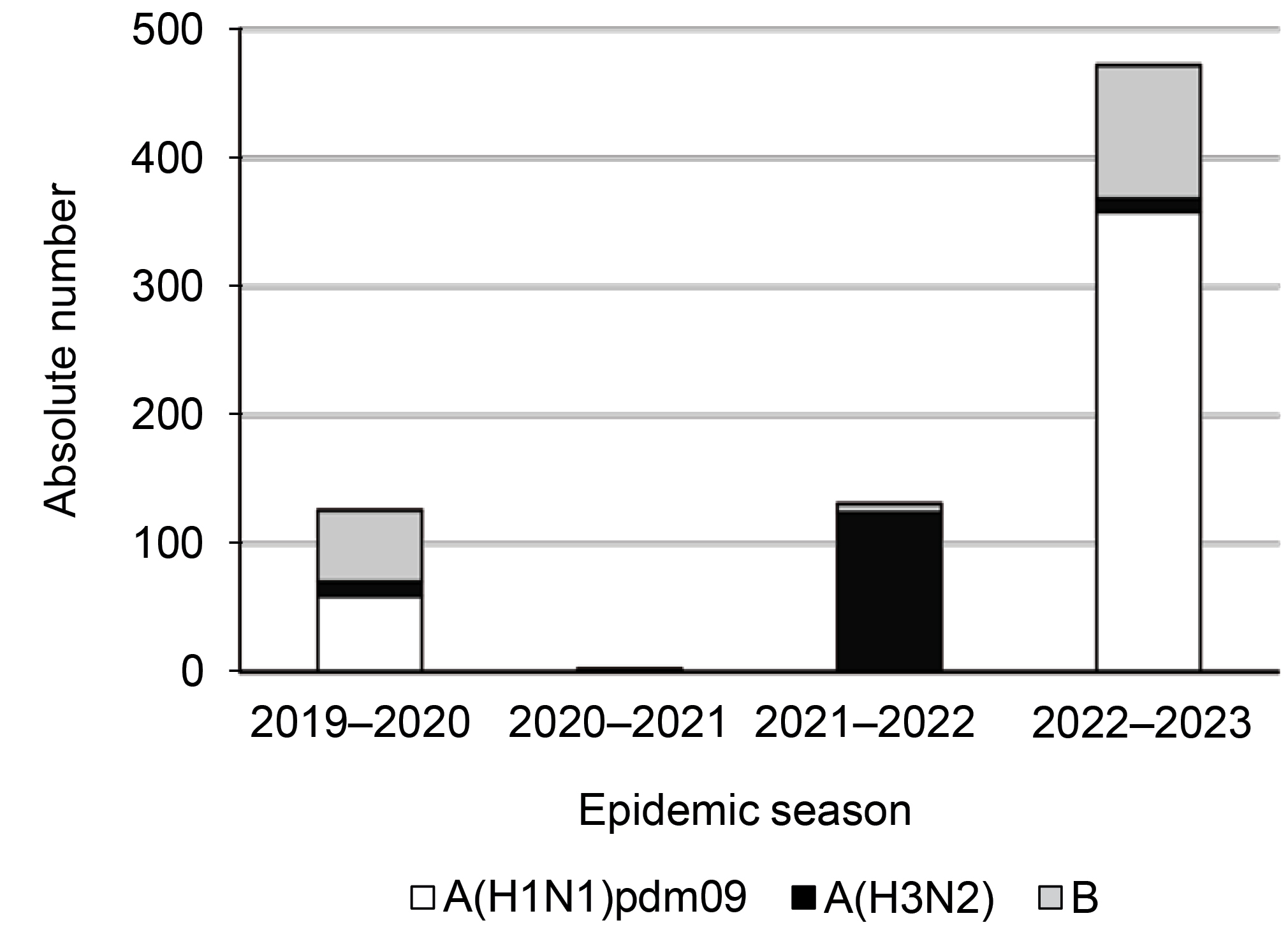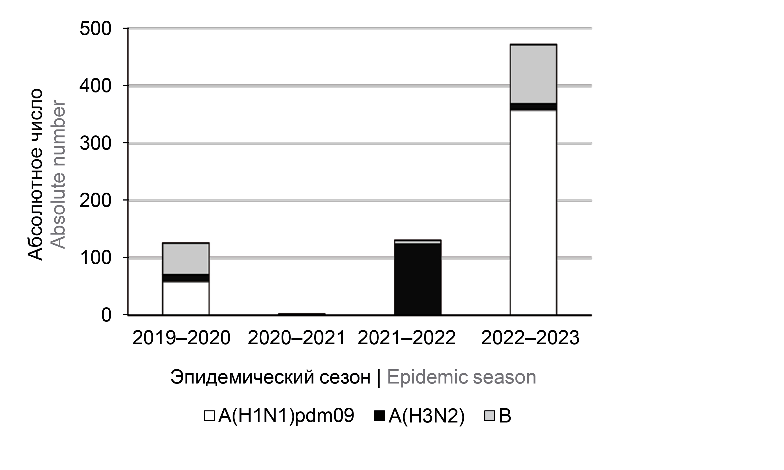 Рис. 1. Количество вирусов гриппа, исследованных в Референс-центре по мониторингу за инфекциями верхних и нижних дыхательных путей в эпидемических сезонах 2019–2023 гг.