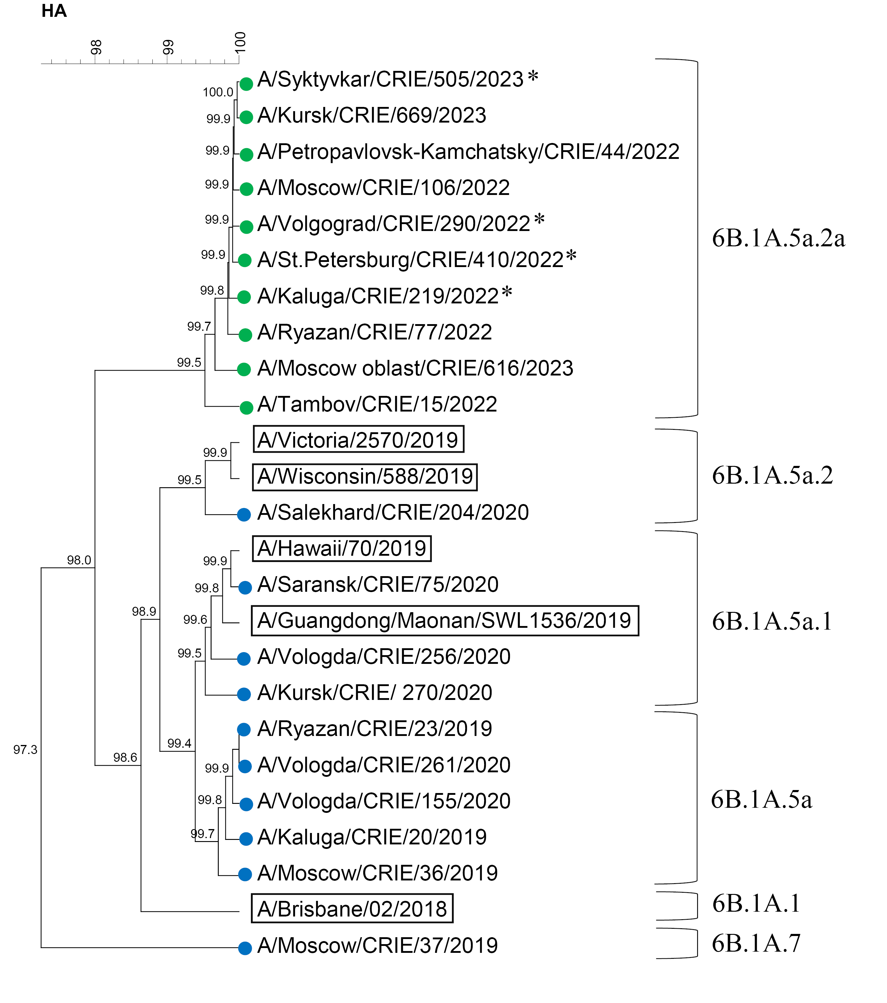 Вакцинные штаммы выделены прямоугольниками. Синими и зелёными кругами обозначены последовательности вирусов, циркулировавших в 2019–2020 и 2022–2023 гг. соответственно. *Летальный случай.