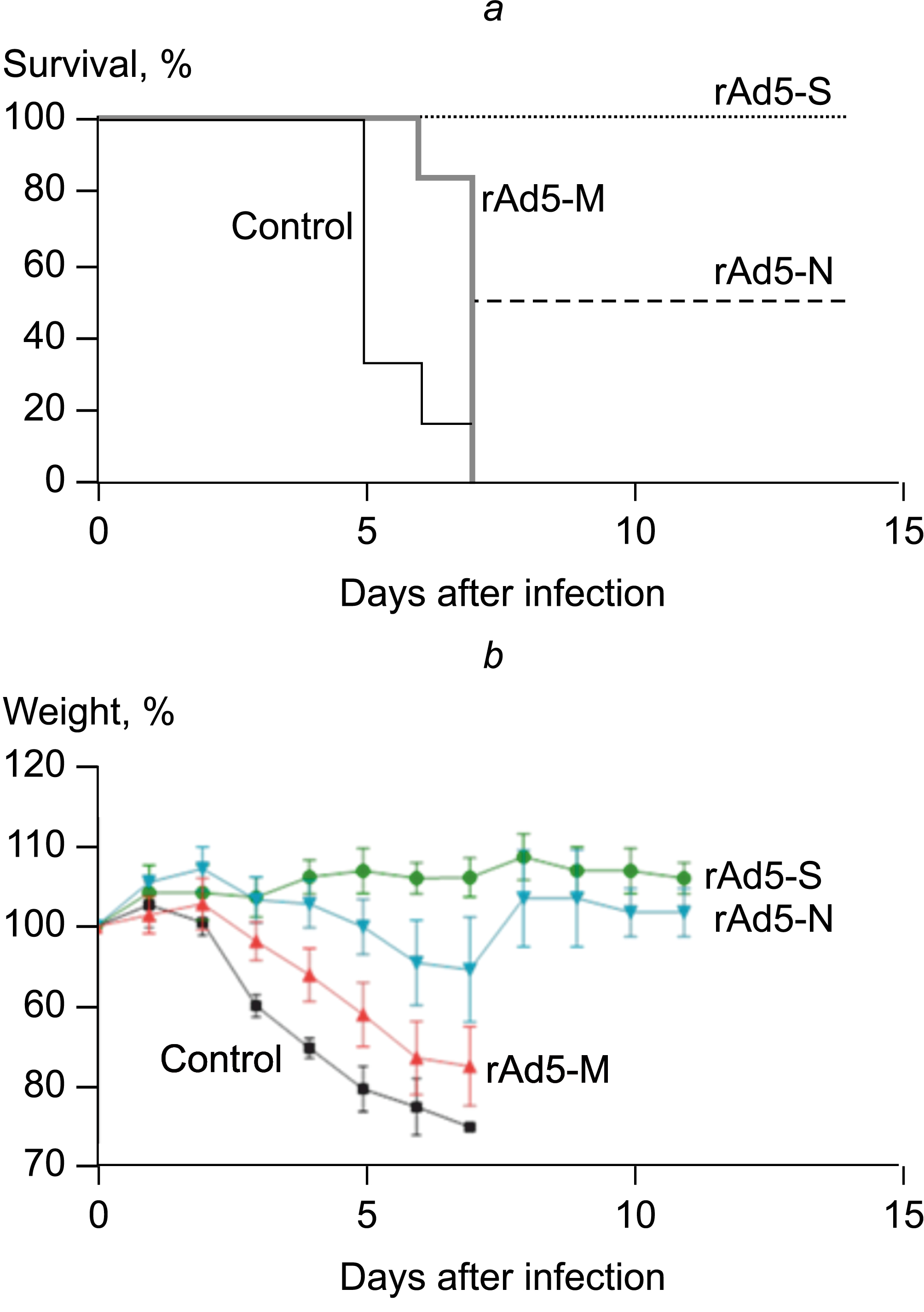 The study used recombinant viral vectors based on human adenovirus type 5 (rAd5) carrying genes of structural proteins of SARS-CoV-2 virus of Wuhan B.1 variant: rAd5-S (carries the gene of glycoprotein S), rAd5-N (carries the gene of nucleoprotein N), rAd5-M (carries the gene of membrane protein M) were used for immunization of animals. Animals of the groups (n = 10 per group) that received the vaccine were injected with rAd5 vaccines at a dose of 109 v.p./animal intramuscularly twice with an interval of 21 days. Animals in the control group (n = 10) were injected with an equivalent volume of sterile buffer solution. One week after the 2nd immunization, animals were infected intranasally with SARS-CoV-2 virus at a dose of 105 TCID50 and weight dynamics and survival rate were evaluated daily for 14 days after infection.