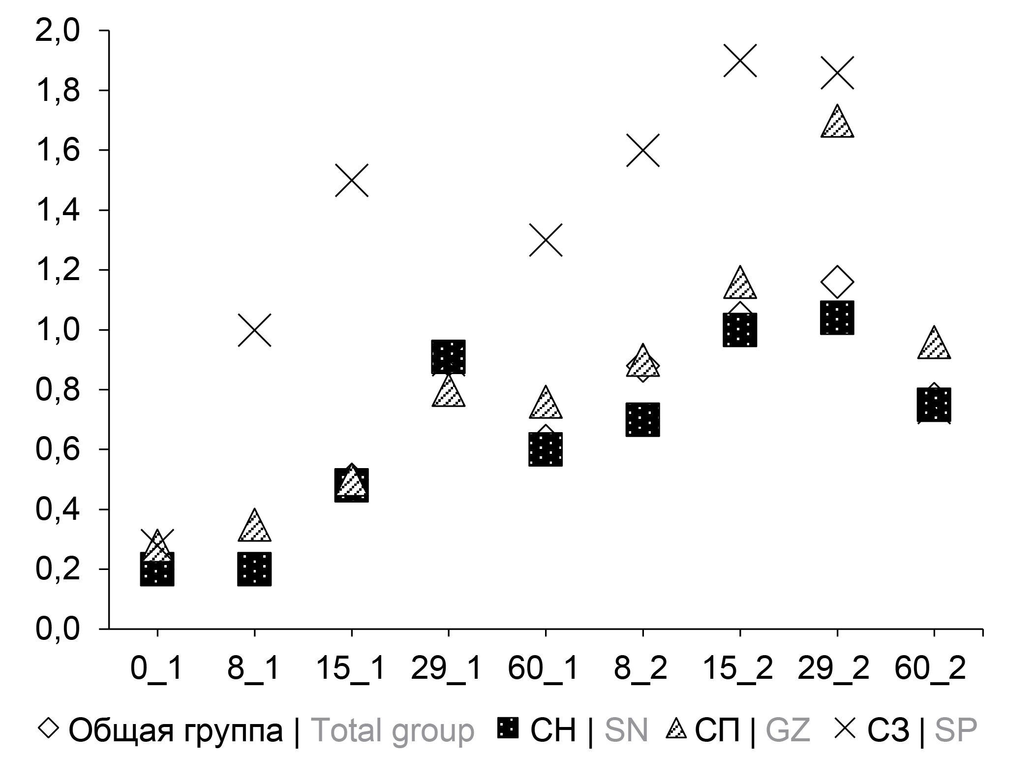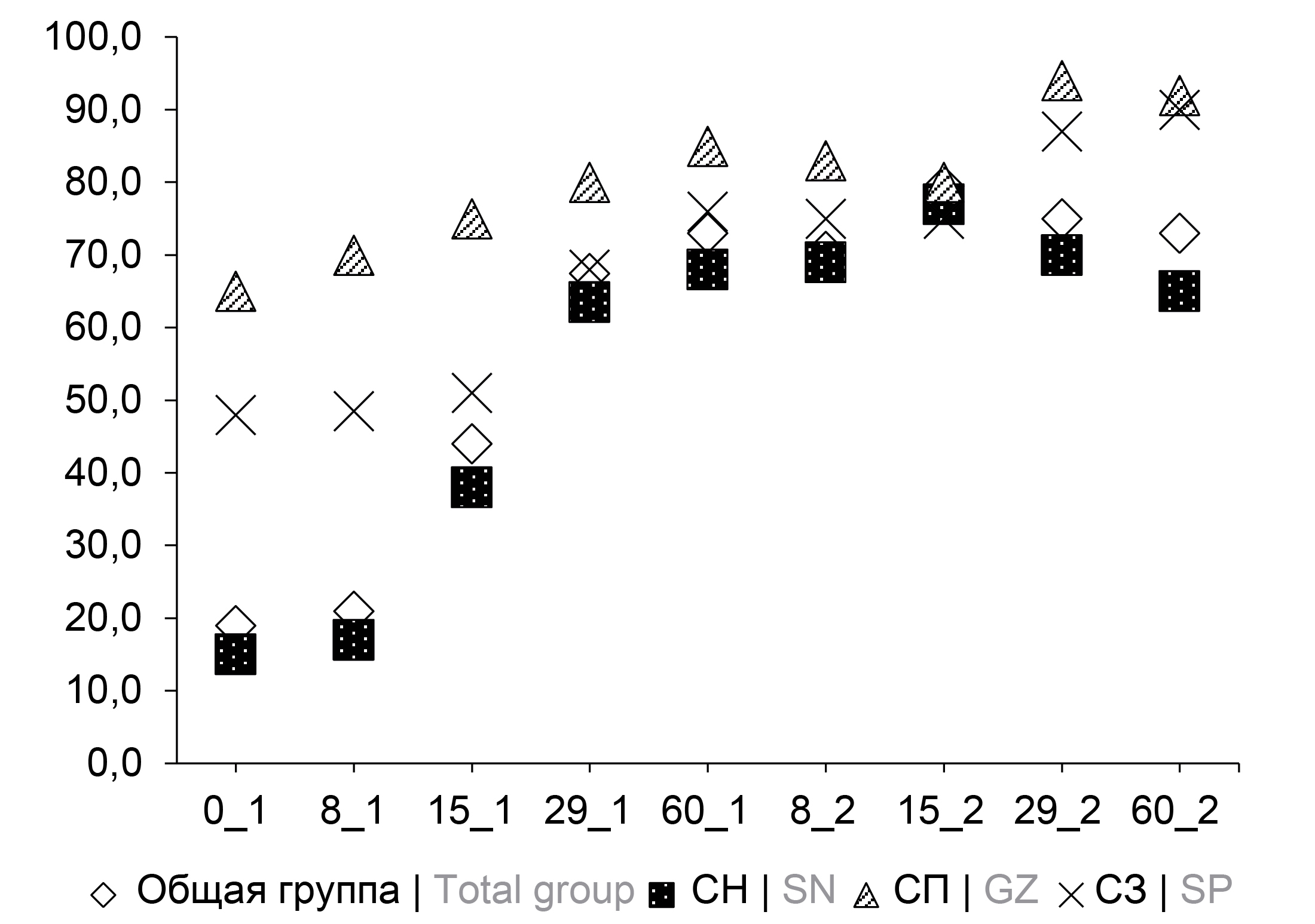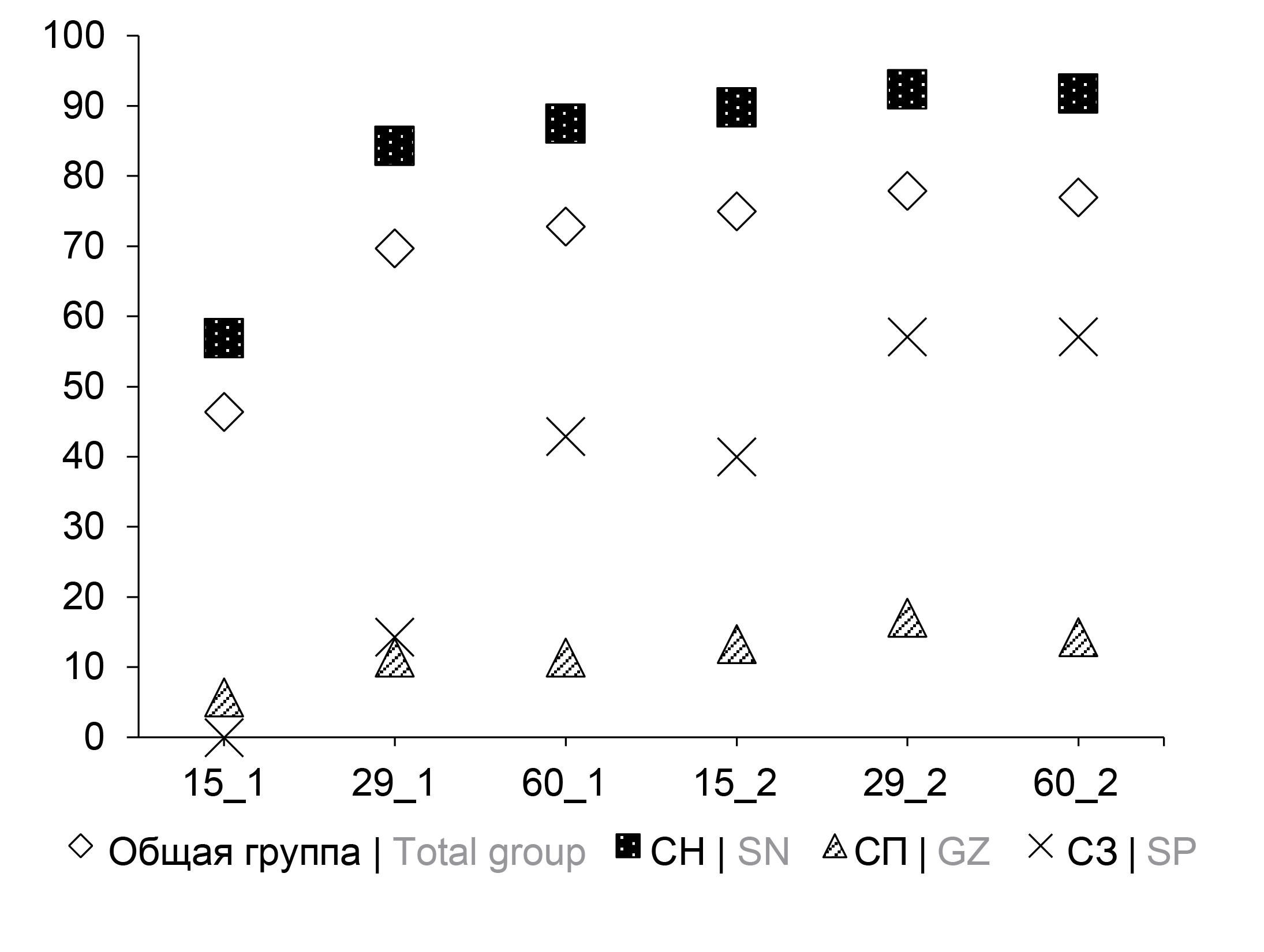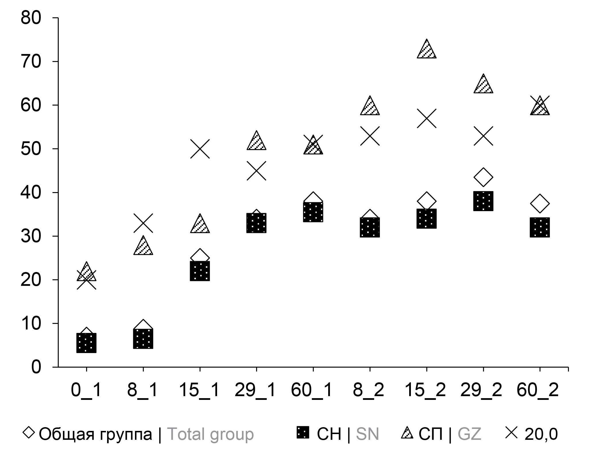 The proportion of volunteers with an agglutination titer of 1 : 80 or higher on days 8, 15, 29, and 60 after the 1st vaccination was 38.1, 56.0, 73.6, and 65.8%, and 66.8, 77.6, 77.6 and 80.0% after the 2nd vaccination. After the 1st vaccination, the proportion of volunteers with an agglutination titer of 1 : 80 in the total vaccinated group was statistically significantly different from the distinguished subgroups. After the 2nd vaccination, no statistically significant differences were found between subgroups. The highest percentage of individuals who met the specified criterion was found in the group of SP volunteers (from 80.0% on day 15 after the 1st administration to 94.3% on days 15 and 60 after the 2nd vaccine administration). In the SN subgroup, for the same time interval, this indicator ranged from 51.5–75.9%, in the SP subgroup — 42.9–100.0%.