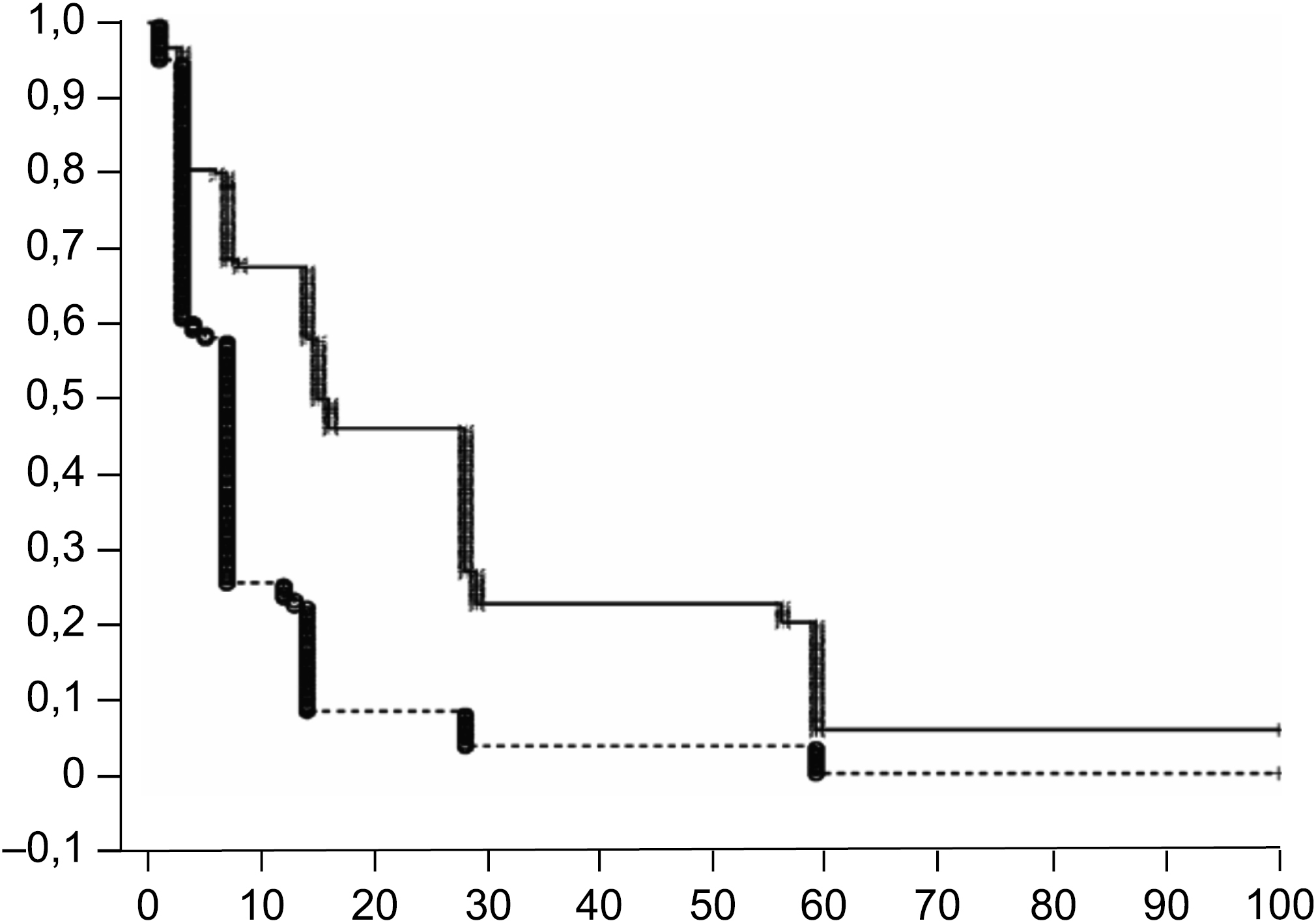 The elimination time of attenuated bacteria from the nasopharynx and oropharynx was estimated as a time interval in days from the moment of administration (1 h) until the established level was reached. The average B. pertussis DNA level of 0.7 GE/mL in both groups at the screening stage was taken as the level at which the elimination of bacteria was determined to be complete. If the indicated level was not reached, the elimination time was taken as 100 days. To compare the groups of volunteers after the 2nd bacterial administration and the 1st vaccination, we used the Kaplan–Meier method (Survival Analysis — Comparison of Two Samples module of the Statistica v. 10.0 program), which allows the use of censored data. Cases that did not reach the set level of 0.7 GE/mL were classified as censored data. Such cases were reported after the 1st vaccination, representing 6.2% (13 of 210), and 1 case less than 1.0% after the 2nd vaccination (1 of 202). The appropriateness of this method is because, as with the survival analysis, not all individuals had completed excretion by the time the study was completed (censored data), but they were not excluded but were used in the analysis. Differences were assessed using the log-rank test.