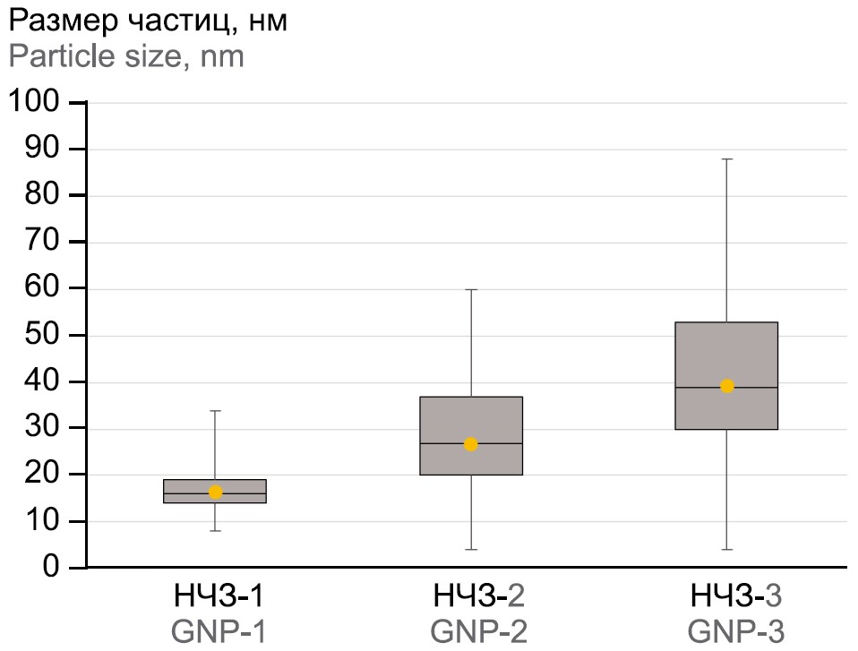 Три группы НЧЗ были охарактеризованы с использованием пакета программ R с построением диаграмм размаха (функции Box Plot) (рис. 3). Степень дисперсии максимальна для частиц самого большого размера НЧЗ-3 (30–56 нм). Для НЧЗ-1 разброс минимален (14–18 нм), размеры для НЧЗ-2 находились в интервале 20–37 нм. Количественные данные проверяли на соответствие закону нормального распределения по критерию W Шапиро–Уилка (р ≤ 0,05) и положению медиан для НЧЗ-1, НЧЗ-2 и НЧЗ-3. Для всех препаратов НЧЗ распределение размеров немного отличалось от нормального.