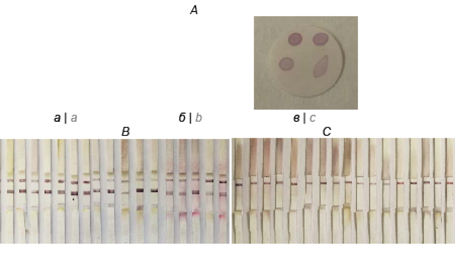 Fig. 5. Results of dot immunoassay using (А) GNP conjugated with recAg (a — GNP-1; b — GNP-2; c — GNP-3) and immunochromatographic analysis of positive (B) and negative (C) serum samples using GNP-3 conjugated with recAg.
